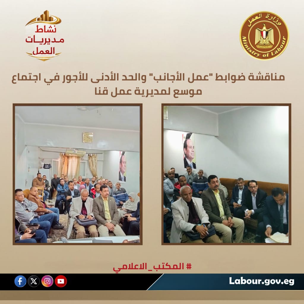 تنفيذاً لتوجيهات الوزير حسن الرداد بتوحيد آليات الرقابة؛ شارك أحمد محمد معوض، مدير مديرية عمل قنا، في اجتماع "فيديو كونفرانس" برئاسة سيد شرقاوي مدير عام تفتيش العمل بالوزارة. تناول الاجتماع توحيد إجراءات التفتيش على تراخيص الأجانب، وتطبيق الحد الأدنى للأجور، ونسبة الـ 5% لذوي الهمم، مع فك التشابك القانوني بين "إنهاء وانتهاء" علاقة العمل، وذلك لضمان دقة التنفيذ وتوحيد المفاهيم الرقابية بجميع مكاتب التفتيش بمحافظة قنا