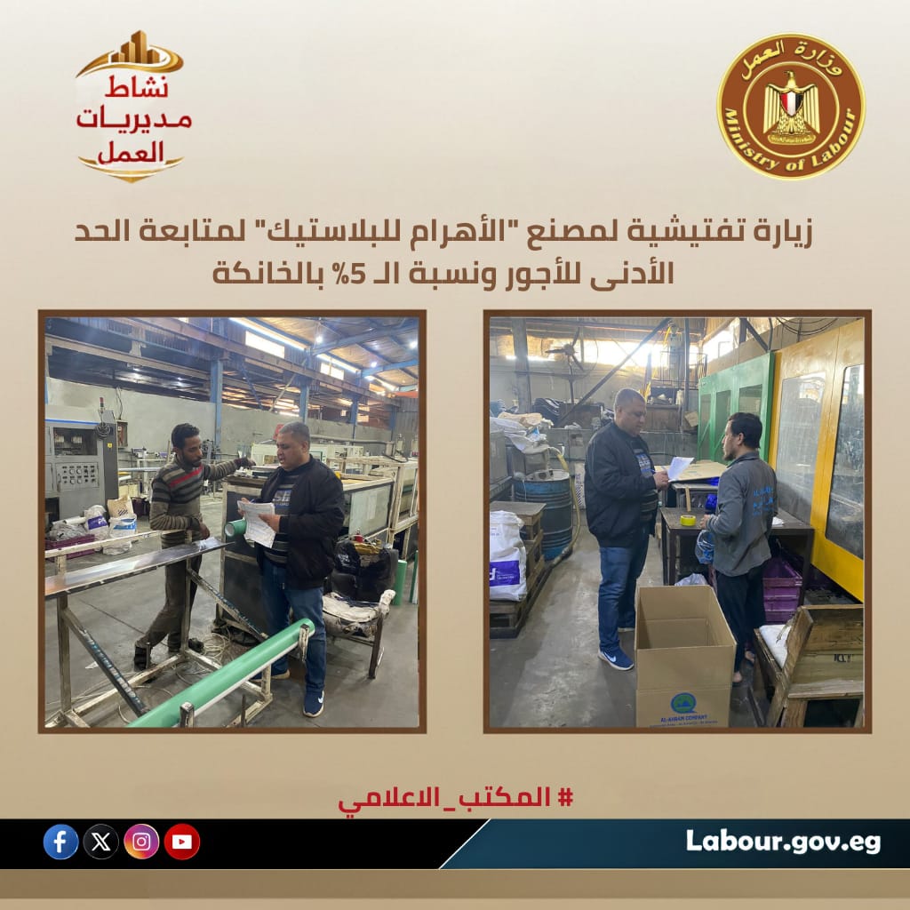 تنفيذاً لتوجيهات الوزير حسن الرداد ؛ نظمت مديرية عمل القليوبية، تحت إشراف فوزي صابر، زيارة ميدانية لمنطقة أمل (1) الصناعية بالخانكة. استهدفت الزيارة التأكد من استيفاء نسبة تعيين ذوي الهمم، وتطبيق الحد الأدنى للأجور، واشتراطات السلامة والصحة المهنية بمصنع "الأهرام لحقن البلاستيك"، وذلك في إطار جهود المديرية لتعزيز علاقات العمل ودعم الاستقرار الإنتاجي وحماية حقوق العمال بمنطقة الخانكة