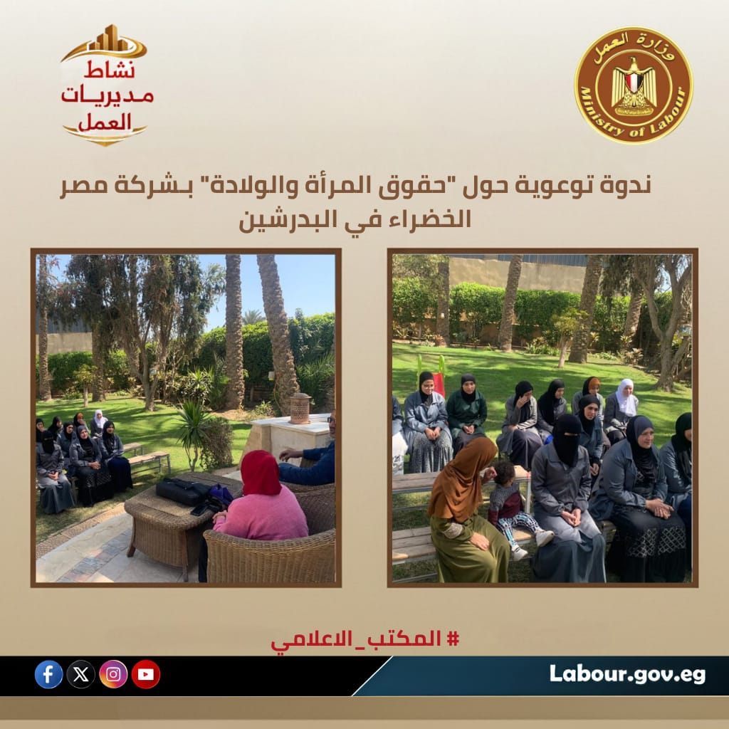 تنفيذاً لتوجيهات الوزير حسن رداد بتكثيف الوعي بالتشريعات العمالية؛ نظمت مديرية عمل الجيزة، من خلال مكتب عمل البدرشين، ندوة موسعة بمقر شركة "مصر الخضراء" حول حقوق وواجبات المرأة العاملة. تناولت الندوة الحماية القانونية للنساء، وضوابط إجازات الأمومة ورعاية الطفل، ومعايير البيئة الآمنة، وسط إشادة من إدارة الشركة بدور المديرية في استقرار علاقات العمل وزيادة الإنتاجية من خلال تعريف العاملات بحقوقهن وواجباتهن بمركز البدرشين