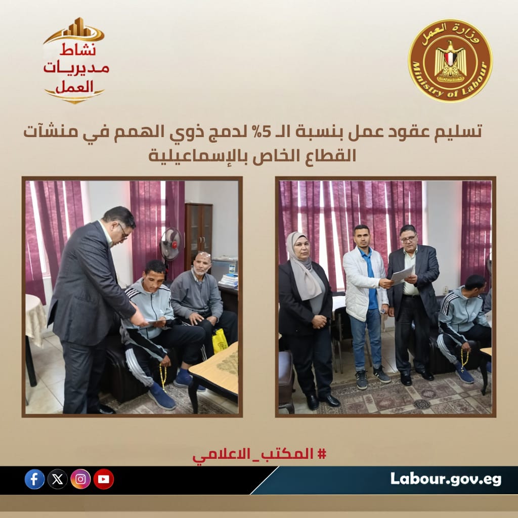 تنفيذاً لتوجيهات الوزير حسن رداد بتمكين ذوي القدرات الخاصة قامت مديرية عمل الإسماعيلية، بقيادة الدكتور أيمن شعبان مدير المديرية ، بتسليم دفعة جديدة من عقود العمل لذوي الهمم ب شركات القطاع الخاص. أكدت سامية عبد السلام مدير مكتب التفتيش، أن المديرية تواصل التنسيق مع أصحاب الأعمال لاستيفاء النسبة القانونية وتوفير فرص عمل لائقة تضمن حياة كريمة ومشاركة فاعلة لأبناء محافظة الإسماعيلية