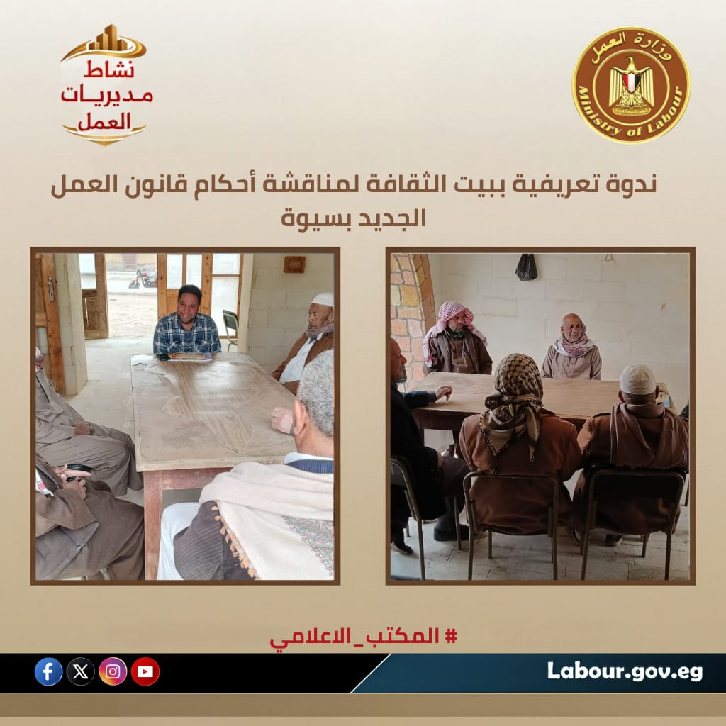 تنفيذاً لتعليمات مدير مديرية العمل بالوادي الجديد وإدارة الرعاية؛ نظم مكتب عمل سيوة ندوة توعوية بمقر بيت ثقافة سيوة، بحضور مدير بيت الثقافة ومفتشي المكتب وعدد من أصحاب الأعمال. تناولت الندوة شرحاً مفصلاً للمواد المستحدثة في قانون العمل الجديد رقم 14 لسنة 2025، بهدف توعية طرفي العملية الإنتاجية بحقوقهم وواجباتهم وضمان التطبيق الأمثل للقانون وتعميق الثقافة العمالية بمركز ومدينة سيوة