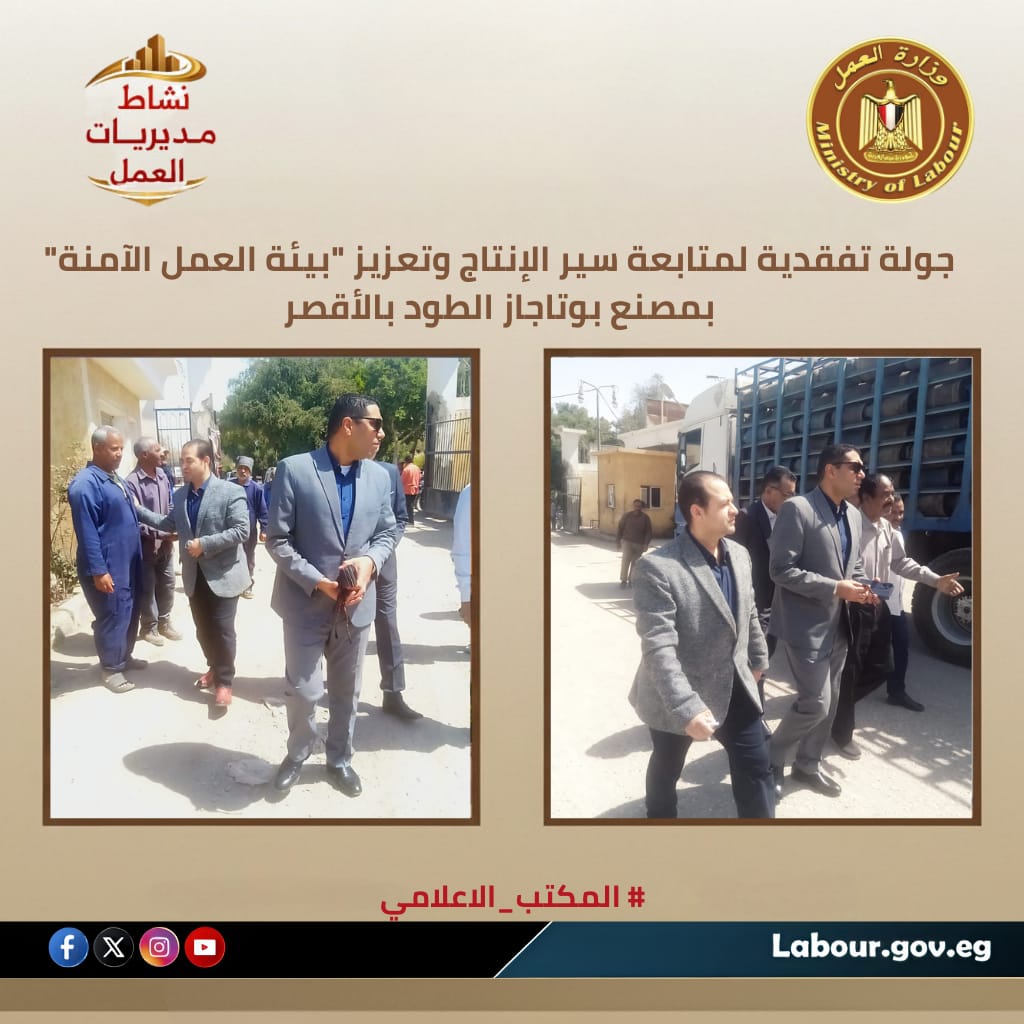 تنفيذاً لتكليفات الوزير حسن رداد ؛ أجرى هشام أبو زيد نائب محافظ الأقصر و مدير المديرية محمود باسل ، جولة ميدانية بمصنع تعبئة البوتاجاز بمركز الطود. شملت الجولة تفقد خطوط الإنتاج وعقد جلسة حوارية مع العمال للاطمئنان على أحوالهم ومتابعة استيفاء حقوقهم وتوافر اشتراطات السلامة المهنية، حيث أكد "باسل" أن التواجد الميداني يهدف لتذليل عقبات الإنتاج ودعم الكوادر البشرية باعتبارهم عماد الاقتصاد القومي بمركز الطود