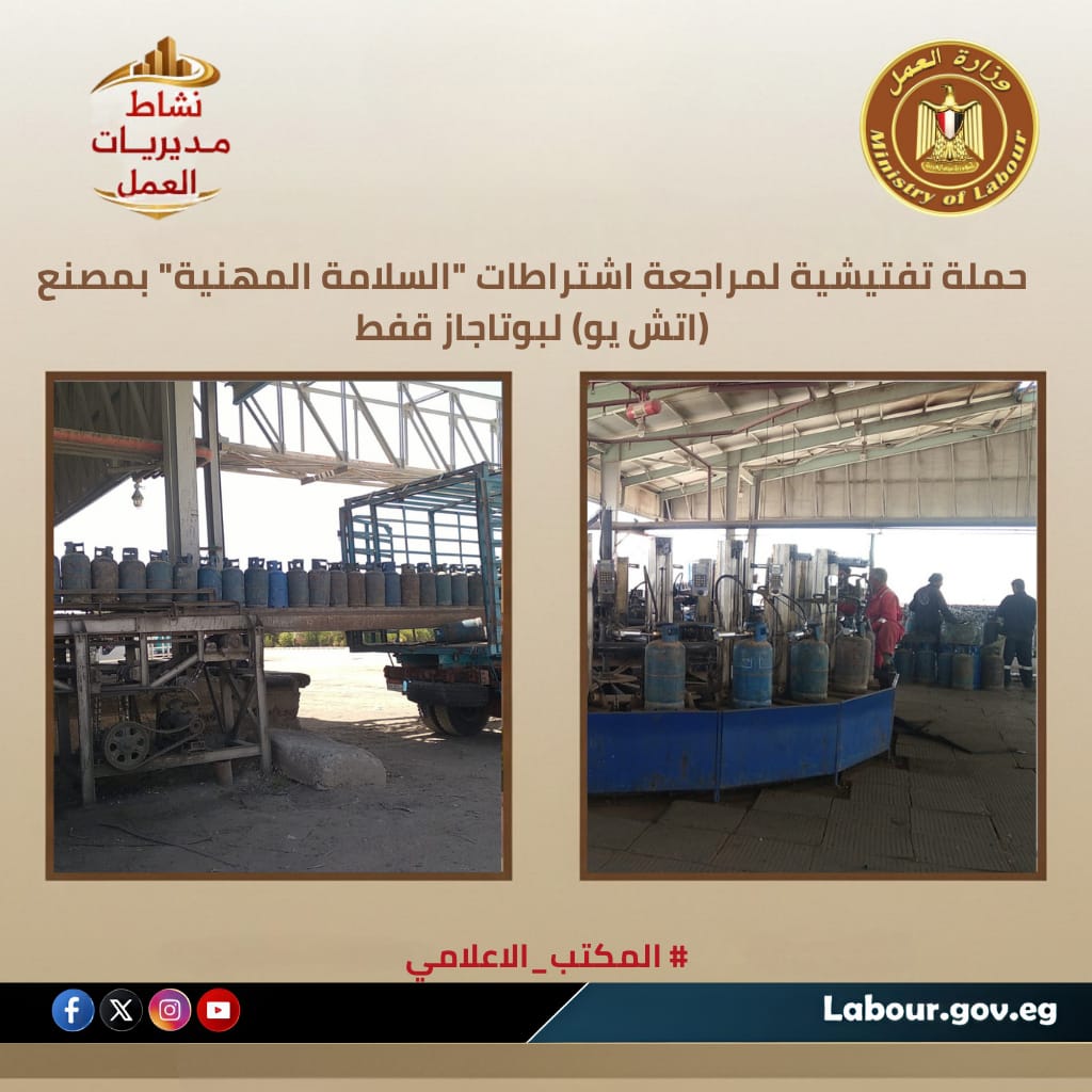 تنفيذاً لتوجيهات الوزير حسن رداد بتشديد الرقابة على المنشآت الحيوية؛ شنت مديرية عمل قنا، بإشراف أحمد محمد معوض، حملة تفتيشية بمشاركة هيئة التنمية الصناعية على مصنع تعبئة أسطوانات البوتاجاز بمركز قفط. شملت الحملة، التي قادها الكيميائي منصف مسعد والكيميائية شيماء رفاعي، فحص وسائل الوقاية والحماية وتوعية العاملين بمخاطر بيئة العمل لضمان تطبيق أعلى معايير السلامة والصحة المهنية والحفاظ على الأرواح والمنشآت بمركز قفط
