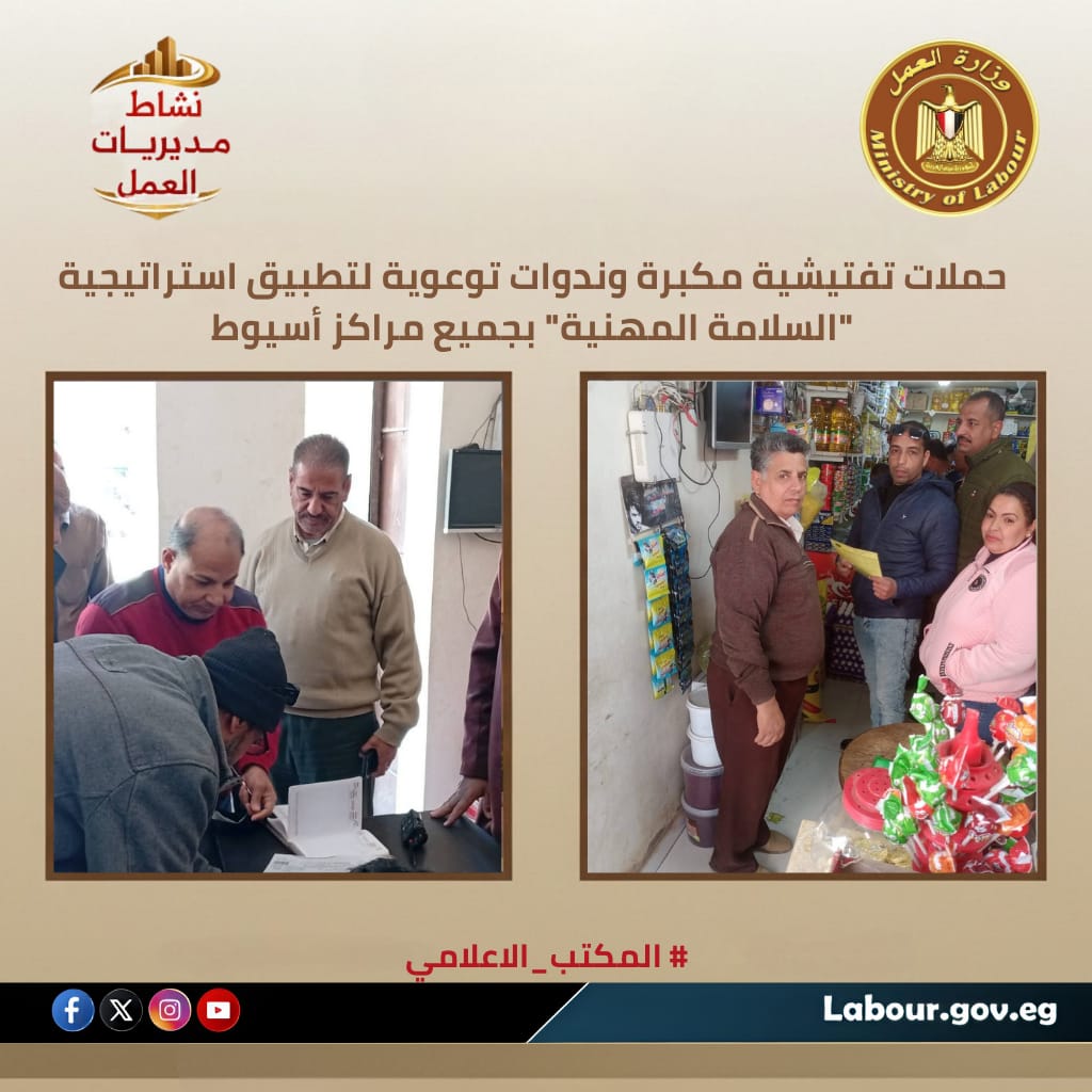 تنفيذاً لتوجيهات الوزير حسن الرداد أطلق الدكتور حازم علي حسن مدير مديرية العمل بأسيوط، غرفة عمليات لمتابعة لجان التفتيش المشتركة بجميع مراكز المحافظة. شملت الحملات المرور على المصانع والمنشآت الصحية والتعليمية لضمان مطابقة بيئة العمل للمعايير القانونية، حيث تم اتخاذ إجراءات فورية ضد المخاطر الداهمة ومنح مهل لإزالة المخالفات. تزامنت الحملات مع عقد ندوات توعوية بمستشفيات منفلوط وديروط وساحل سليم حول "خطط الطوارئ"، وذلك ضمن الرؤية القومية لحماية الثروة البشرية بـمحافظة أسيوط