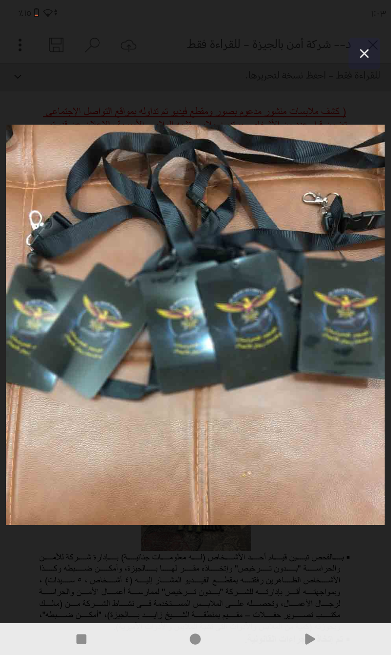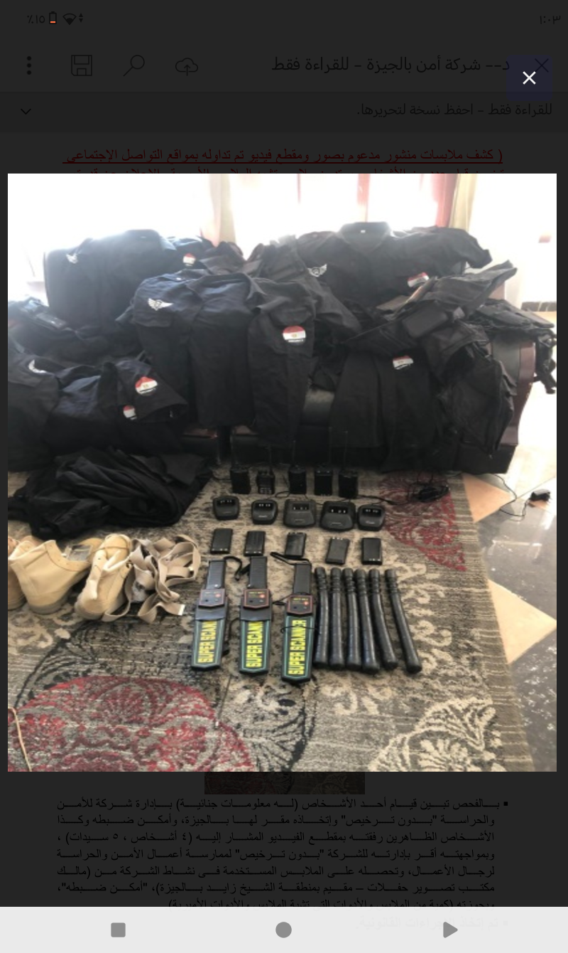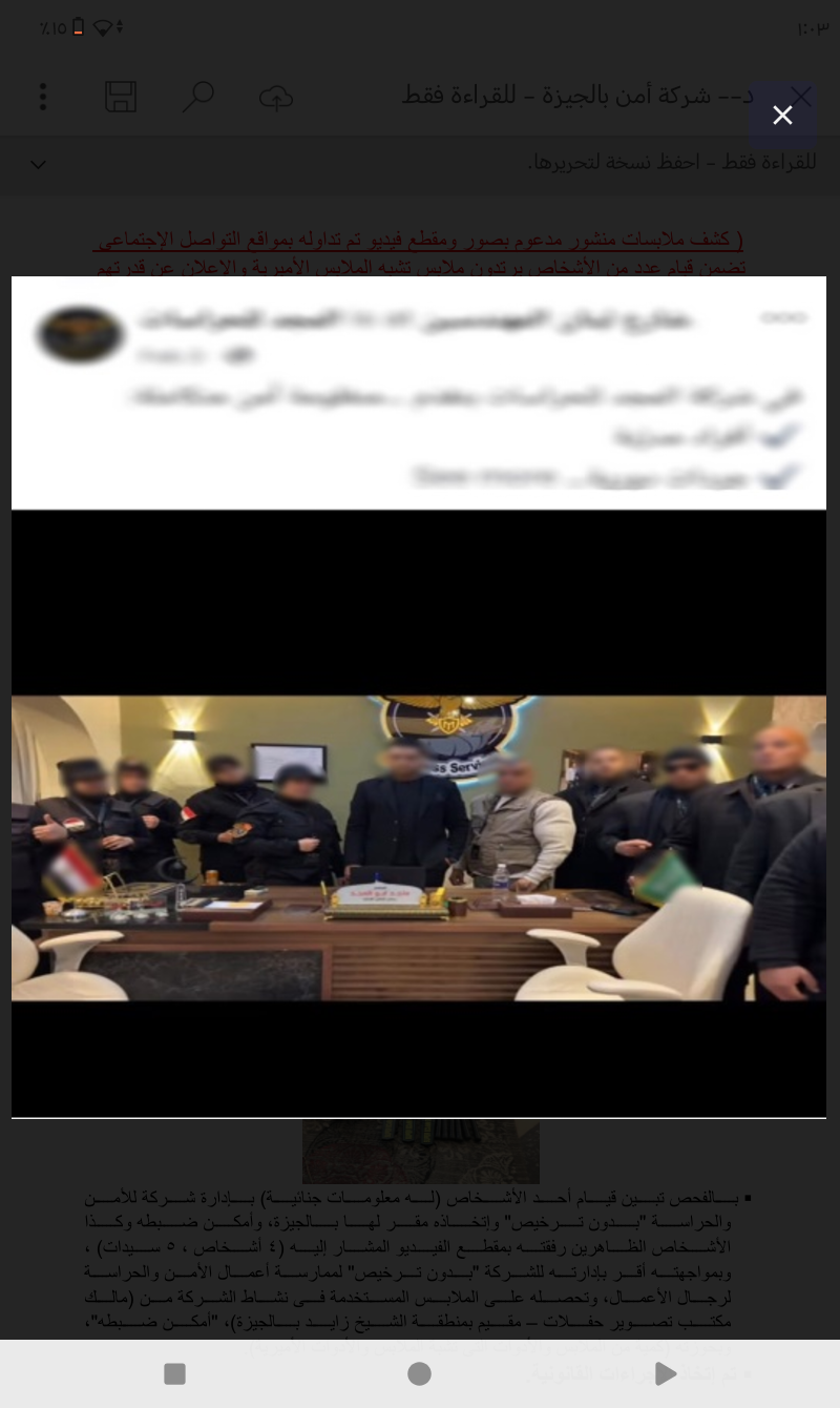 بالفحص تبين قيام أحد الأشخاص (له معلومات جنائية) بإدارة شركة للأمن والحراسة "بدون ترخيص" وإتخاذه مقر لها بالجيزة، وأمكن ضبطه وكذا الأشخاص الظاهرين رفقته بمقطع الفيديو المشار إليه (4 أشخاص ، 5 سيدات) ، وبمواجهته أقر بإدارته للشركة "بدون ترخيص" لممارسة أعمال الأمن والحراسة لرجال الأعمال، وتحصله على الملابس المستخدمة فى نشاط الشركة من (مالك مكتب تصوير حفلات – مقيم بمنطقة الشيخ زايد بالجيزة)، "أمكن ضبطه"، وبحوزته (كمية من الملابس والأدوات التى تشبة الملابس والأدوات الأميرية).