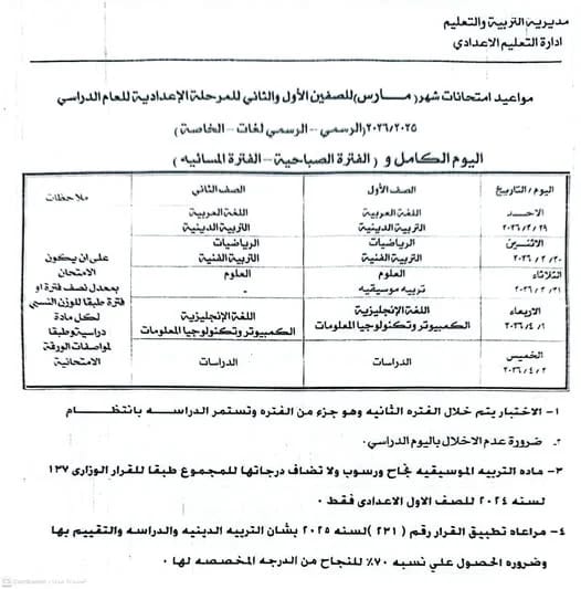 تعليم القليوبية تعلن جدول امتحانات مارس 2026 للإعدادية