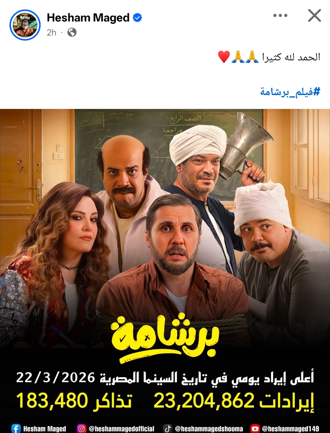 علق الفنان هشام ماجد على تصدر فيلم برشامة قائمة الإيرادات في دور العرض السينمائي ضمن أفلام عيد الفطر المبارك 2026.