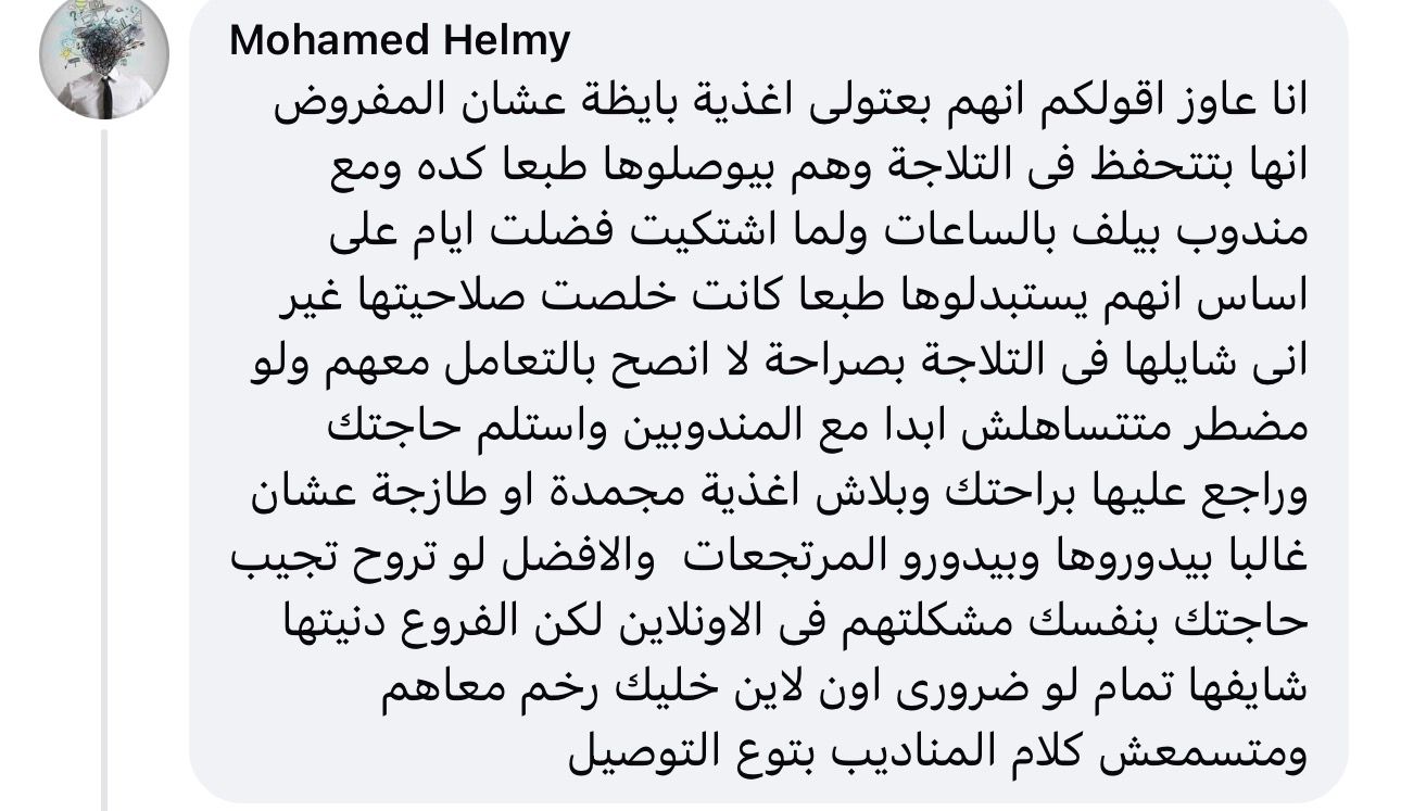 كما استعرض شخص اخر شكوته مع كارفور قائلا: انا عاوز اقولكم انهم بعتولى اغذية بايظة عشان المفروض انها بتتحفظ فى التلاجة وهم بيوصلوها طبعا كده ومع مندوب بيلف بالساعات ولما اشتكيت فضلت ايام على اساس انهم يستبدلوها طبعا كانت خلصت صلاحيتها غير انى شايلها فى التلاجة بصراحة لا انصح بالتعامل معهم ولو مضطر متتساهلش ابدا مع المندوبين واستلم حاجتك وراجع عليها براحتك وبلاش اغذية مجمدة او طازجة عشان غالبا بيدوروها وبيدورو المرتجعات والافضل لو تروح تجيب حاجتك بنفسك مشكلتهم فى الاونلاين لكن الفروع دنيتها شايفها تمام لو ضرورى اون لاين خليك رخم معاهم ومتسمعش كلام المناديب بتوع التوصيل".