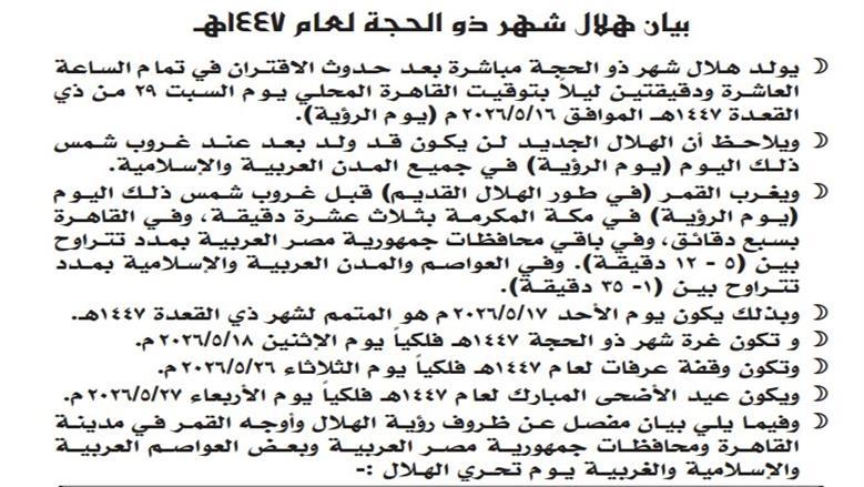 وأكد المعهد القومي للبحوث الفلكية والجيوفيزيقية التابع لوزارة التعليم العالي أن الحسابات الفلكية تشير إلى ميلاد هلال شهر ذي الحجة 1447 هجريًا يوم السبت 16 مايو 2026 ميلاديًا.