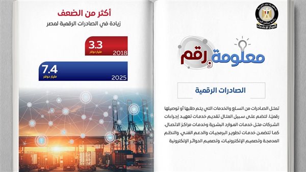 في خطوة تؤكد سعي مصر للحاق بركب الاقتصاد العالمي المتطور، مصر تواصل تركيز جهودها لمضاعفة حجم الصادرات الرقمية، لتشهد زيادة تتخطى الضعف خلال الفترة (2018-2025)، لتصل إلى 7.4 مليار دولار مقارنة بـ 3.3 مليار دولار، جاء هذا الارتفاع مدفوعًا بنمو صادرات خدمات التعهيد التي بلغت 4.8 مليار دولار في عام 2025، إلى جانب توقيع مذكرات تفاهم مع 55 شركة عالمية ومحلية لدعم نمو صناعة التعهيد لتوفير 75 ألف فرصة عمل جديدة.