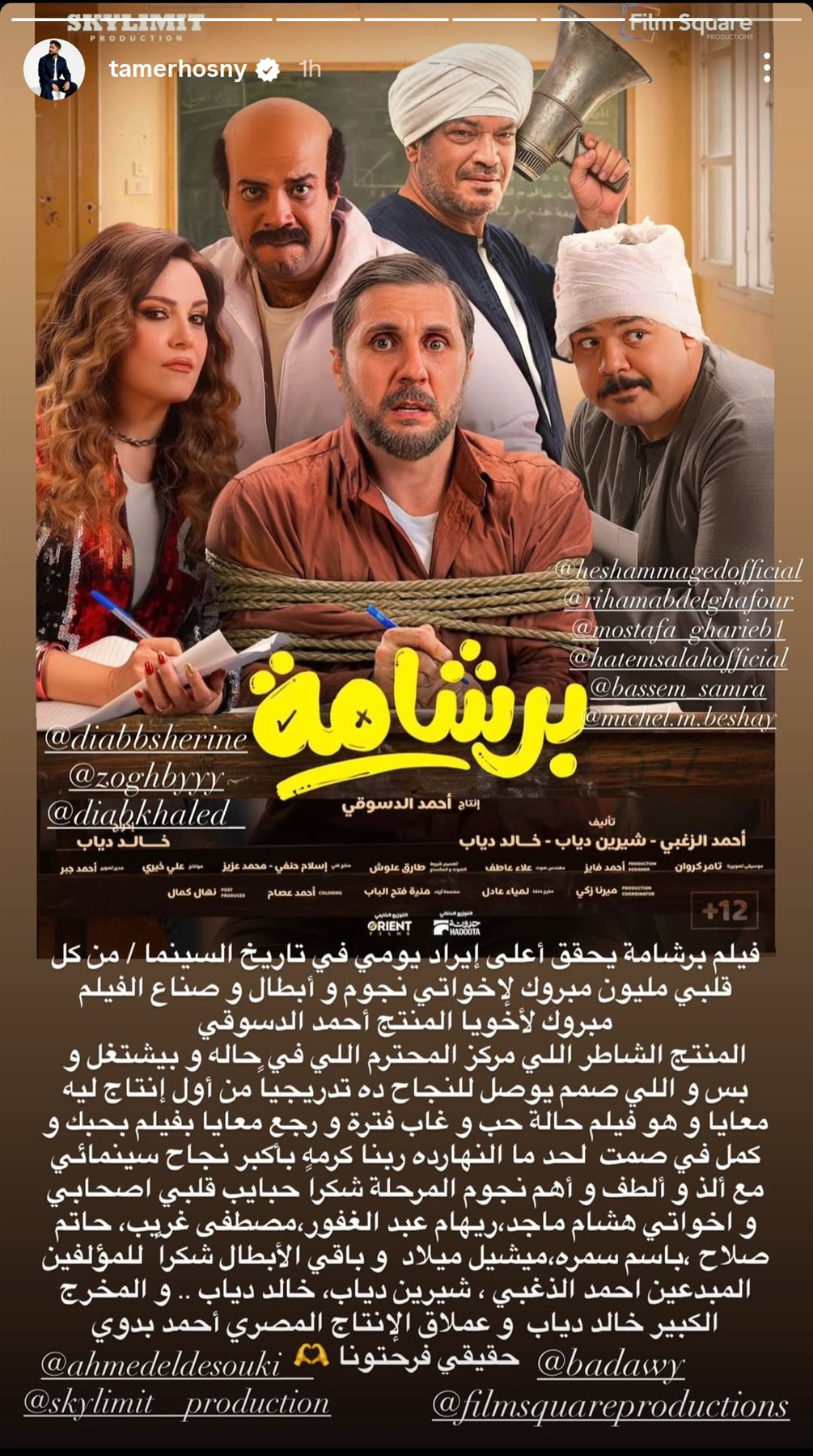 أضاف: المنتج الشاطر اللي مركز المحترم اللي في حاله و بيشتغل و بس و اللي صمم يوصل للنجاح ده تدريجيا من أول إنتاج ليه معايا و هو فيلم حالة حب و غاب فترة و رجع معايا بفيلم بحبك و كمل في صمت لحد ما النهارده ربنا كرمه بأكبر نجاح سينمائي مع ألذ و ألطف و أهم نجوم المرحلة شكرا حبايب قلبي اصحابي و اخواتي هشام ماجد ، ريهام عبد الغفور ، مصطفى غريب، حاتم صلاح ، باسم سمره، ميشيل ميلاد و باقي الأبطال شكرا للمؤلفين المبدعين احمد الذغبي ، شيرين دياب، خالد دياب .. و المخرج الكبير خالد دياب و عملاق الإنتاج المصري أحمد بدوي.. حقيقي فرحتونا.