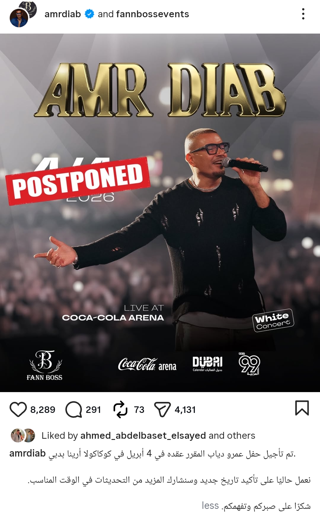 ولم يكشف الفنان عن السبب أو عن الموعد الجديد، وكتب لي بيان رسمي له، من خلال حسابه الرسمي عبر موقع تبادل الصور والفيديوهات القصيرة إنستجرام، قال: تم تأجيل حفل عمرو دياب المقرر عقده في 4 أبريل في كوكاكولا أرينا بدبي.