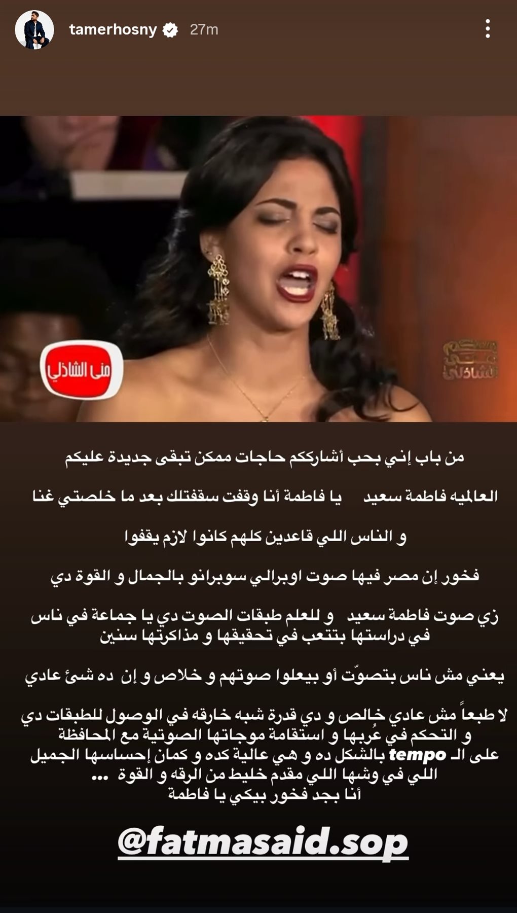 وكتب من خلال حسابه الرسمي عبر موقع تبادل الصور والفيديوهات القصيرة إنستجرام، عبر خاصية ستوري، قال: من باب إني بحب أشارككم حاجات ممكن تبقى جديدة عليكم العالمية فاطمة سعيد يا فاطمة أنا وقفت سقفتلك بعد ما خلصتي غنا و الناس اللي قاعدين كلهم كانوا لازم يقفوا فخور إن مصر فيها صوت اوبرالي سوبرانو بالجمال و القوة دي زي صوت فاطمة سعيد.