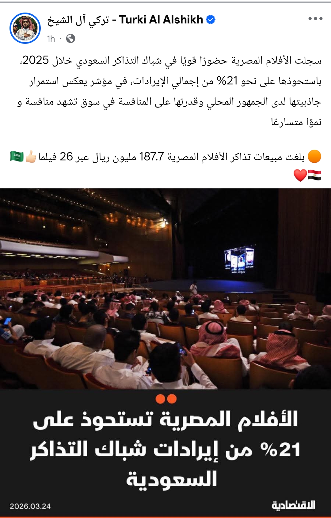 وكتب من خلال حسابه الرسمي عبر موقع التواصل الاجتماعي فيسبوك، قال: سجلت الأفلام المصرية حضورًا قويًا في شباك التذاكر السعودي خلال 2025، باستحوذها على نحو 21% من إجمالي الإيرادات، في مؤشر يعكس استمرار جاذبيتها لدى الجمهور المحلي وقدرتها على المنافسة في سوق تشهد منافسة و نموًا متسارعًا.