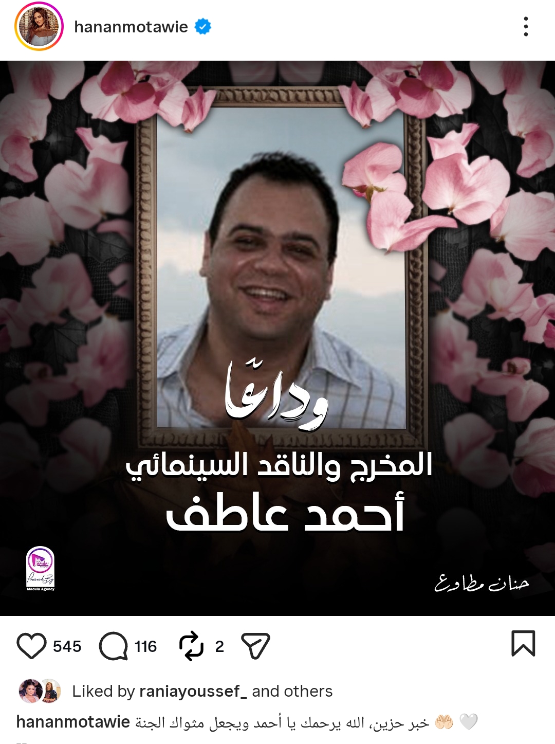 وكتبت حنان مطاوع من خلال حسابها الرسمي عبر موقع تبادل الصور والفيديوهات القصيرة إنستجرام، قالت: خبر حزين.. الله يرحمك يا أحمد ويجعل مثواك الجنة.