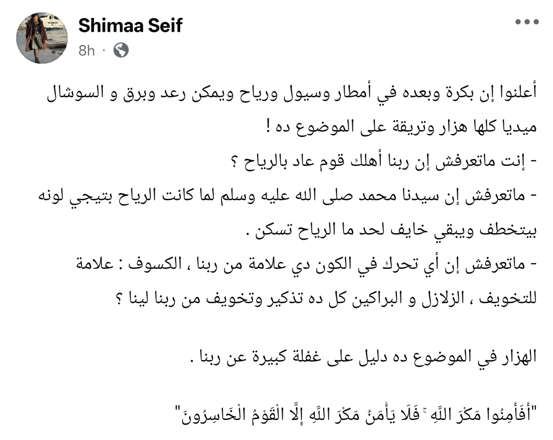 وكتبت شيماء سيف من خلال حسابها الرسمي عبر موقع التواصل الاجتماعي فيسبوك، قالت: أعلنوا إن بكرة وبعده في أمطار وسيول ورياح ويمكن رعد وبرق و السوشال ميديا كلها هزار وتريقة على الموضوع ده !.