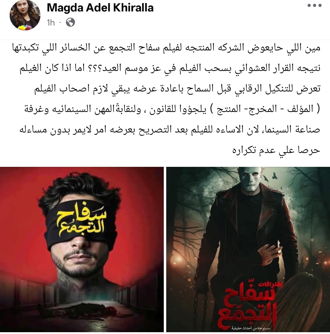 وكتبت من خلال حسابها الرسمي عبر موقع التواصل الاجتماعي فيسبوك، قالت: مين اللي حايعوض الشركه المنتجه لفيلم سفاح التجمع عن الخسائر اللي تكبدتها نتيجه القرار العشوائي بسحب الفيلم في عز موسم العيد؟؟؟.