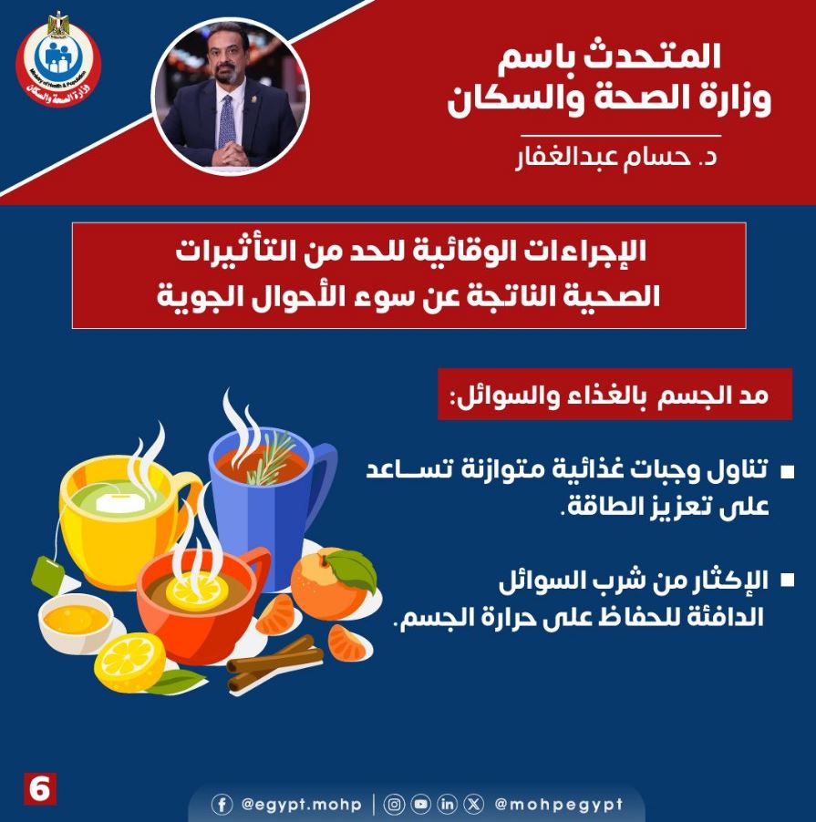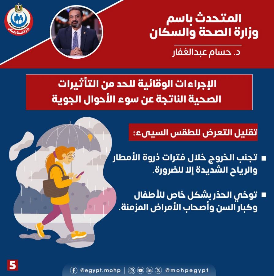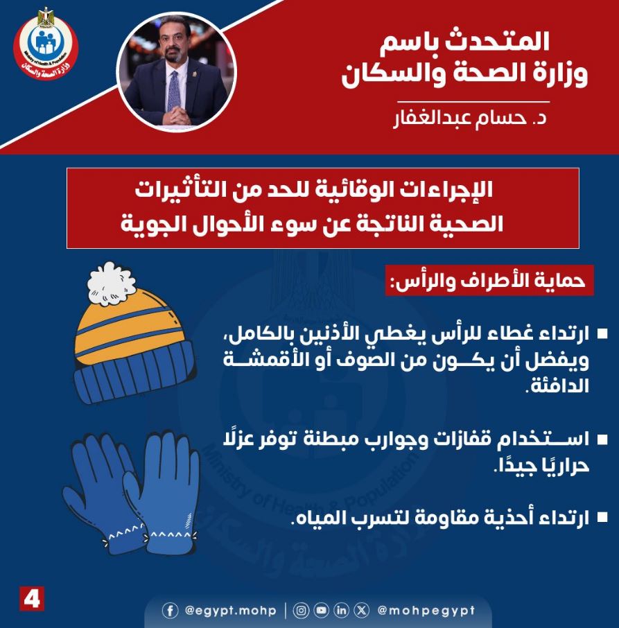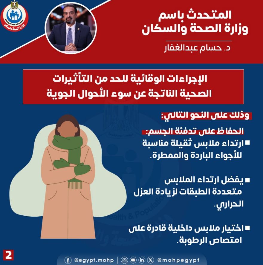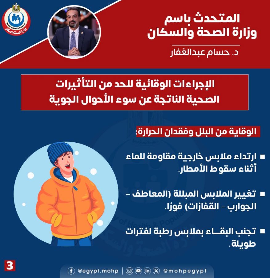 أوضح الدكتور حسام عبدالغفار ، المتحدث الرسمي باسم وزارة الصحة والسكان أن الوزارة تشدد على أهمية التزام المواطنين بمجموعة من الإجراءات الوقائية للحماية من تأثيرات الطقس البارد والممطر وتجنب مضاعفاته.