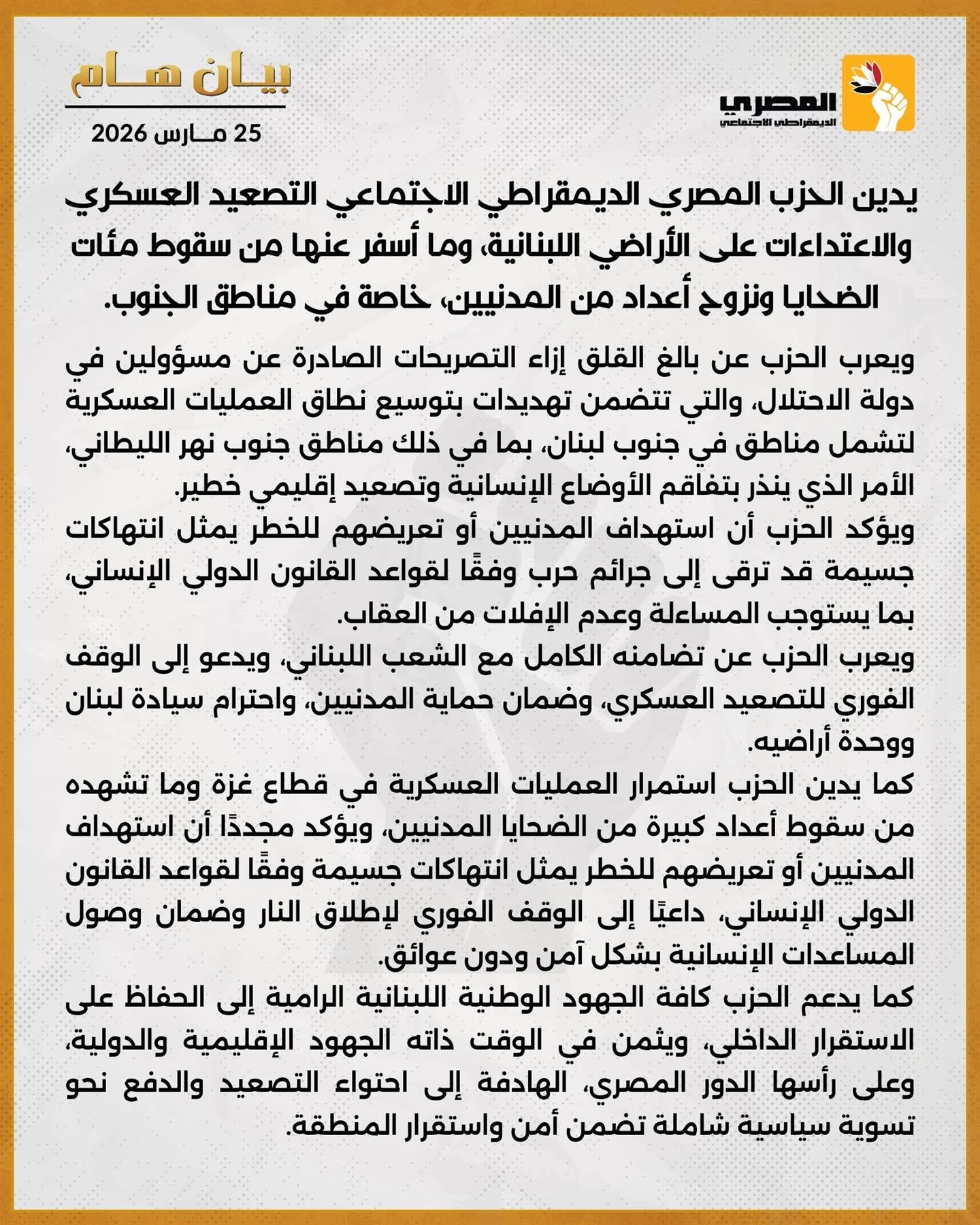 يدين الحزب المصري الديمقراطي الاجتماعي التصعيد العسكري والاعتداءات على الأراضي اللبنانية، وما أسفر عنها من سقوط مئات الضحايا ونزوح أعداد من المدنيين، خاصة في مناطق الجنوب.