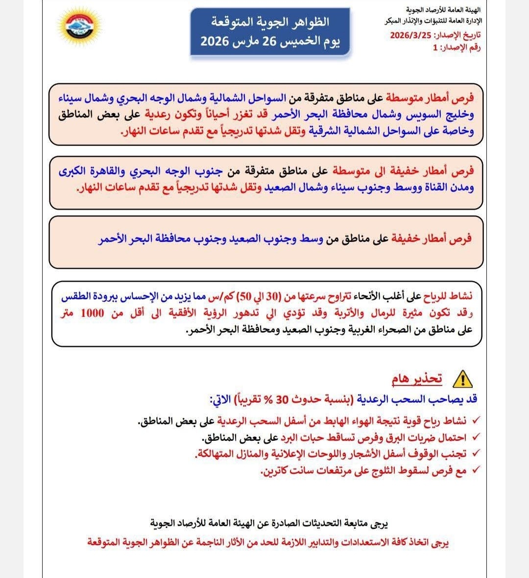 حالة الطقس في مصر غدًا الخميس 26 مارس.. أمطار رعدية ورياح قوية وتحذيرات عاجلة من الأرصاد الجوية