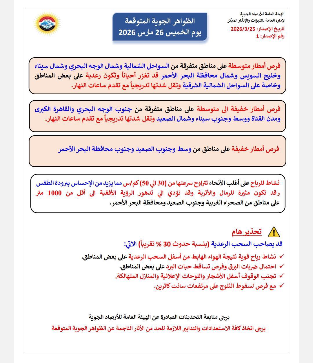 وكانت قد كشفت الهيئة العامة للأرصاد الجوية عن توقعات حالة الطقس الخميس 26 مارس 2026، مع استمرار حالة عدم الاستقرار القوية التي تؤثر على البلاد منذ يوم الأربعاء.ومن المتوقع هطول أمطار متوسطة على مناطق متفرقة من السواحل الشمالية وشمال الوجه البحري وشمال سيناء وخليج السويس وشمال محافظة البحر الأحمر، قد تكون غزيرة أحيانًا ورعدية على بعض المناطق، وخاصة السواحل الشمالية الشرقية، مع تقلص شدتها تدريجيًا مع تقدم ساعات النهار.