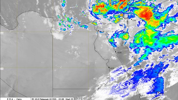 وتابعت :"حيث سجلت أسوان مستوى رؤية 500 متر رمال مثارة ، مع استمرار سقوط الأمطار على مناطق من السواحل الشمالية والوجه البحرى ومناطق من القاهرة الكبرى وخليج السويس وسيناء خلال فترات الليل على فترات متقطعة".
