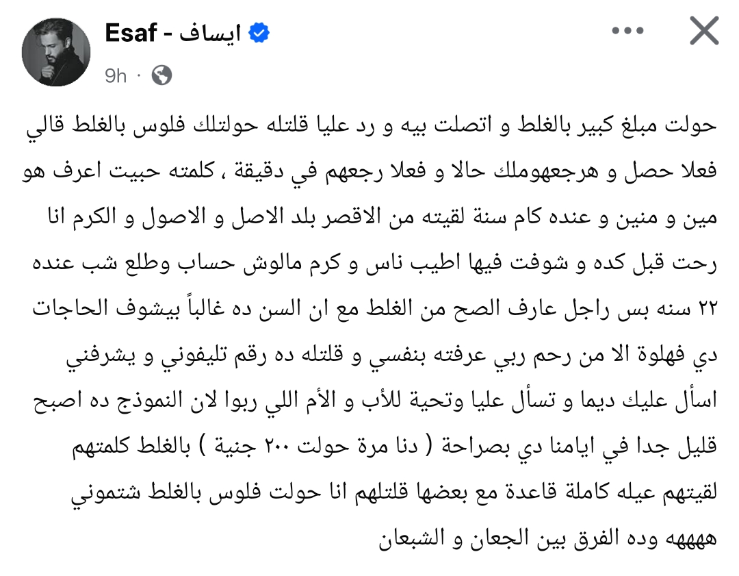 وكتب إيساف من خلال حسابه الرسمي عبر موقع التواصل الاجتماعي فيسبوك، قال: حولت مبلغ كبير بالغلط و اتصلت بيه و رد عليا قلتله حولتلك فلوس بالغلط قالي فعلا حصل و هرجعهوملك حالا و فعلا رجعهم في دقيقة.