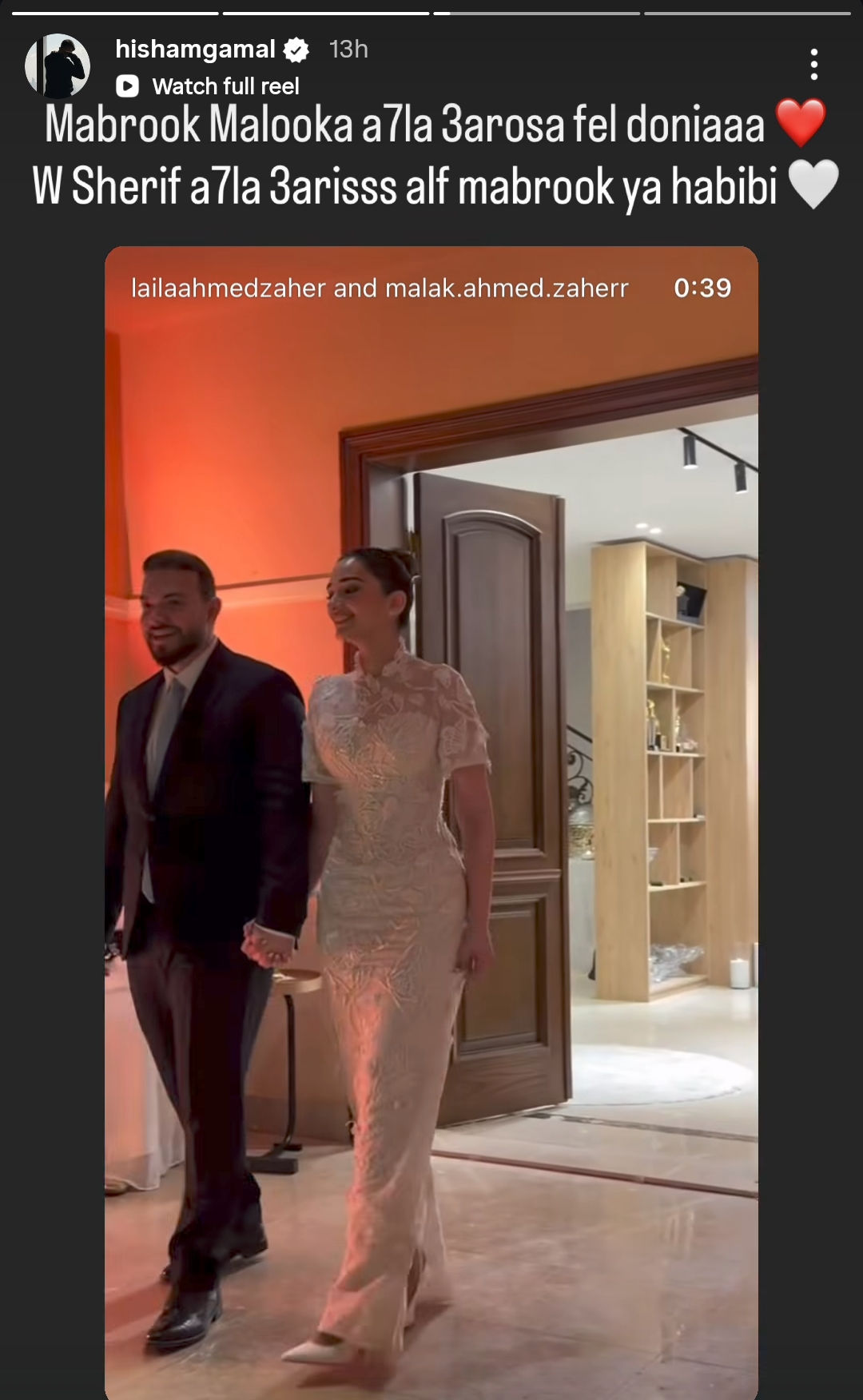 ونشر هشام جمال مقطع فيديو للعروسين من خلال حسابه الرسمي عبر موقع تبادل الصور والفيديوهات القصيرة إنستجرام، قال: مبروك ملوكة أحلى عروسة في الدنيا وشريف أحلى عريس.. ألف مبروك يا حبيبي.
