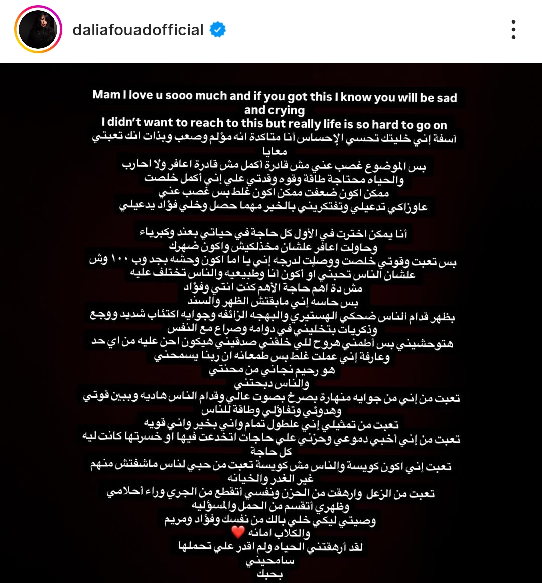 وقالت داليا فؤاد عبر صفحتها الشخصية على موقع التواصل الاجتماعى: آسفة إني خليتك تحسي الإحساس أنا متاكدة انه مؤلم وصعب وبذات انك تعبتي معايا بس الموضوع غصب عني مش قادرة أكمل مش قادرة اعافر ولا احارب والحياه محتاجة طاقة وقوه وقدتي علي إني أكمل خلصت ممكن اكون ضعفت ممكن اكون غلط بس غصب عني ".
