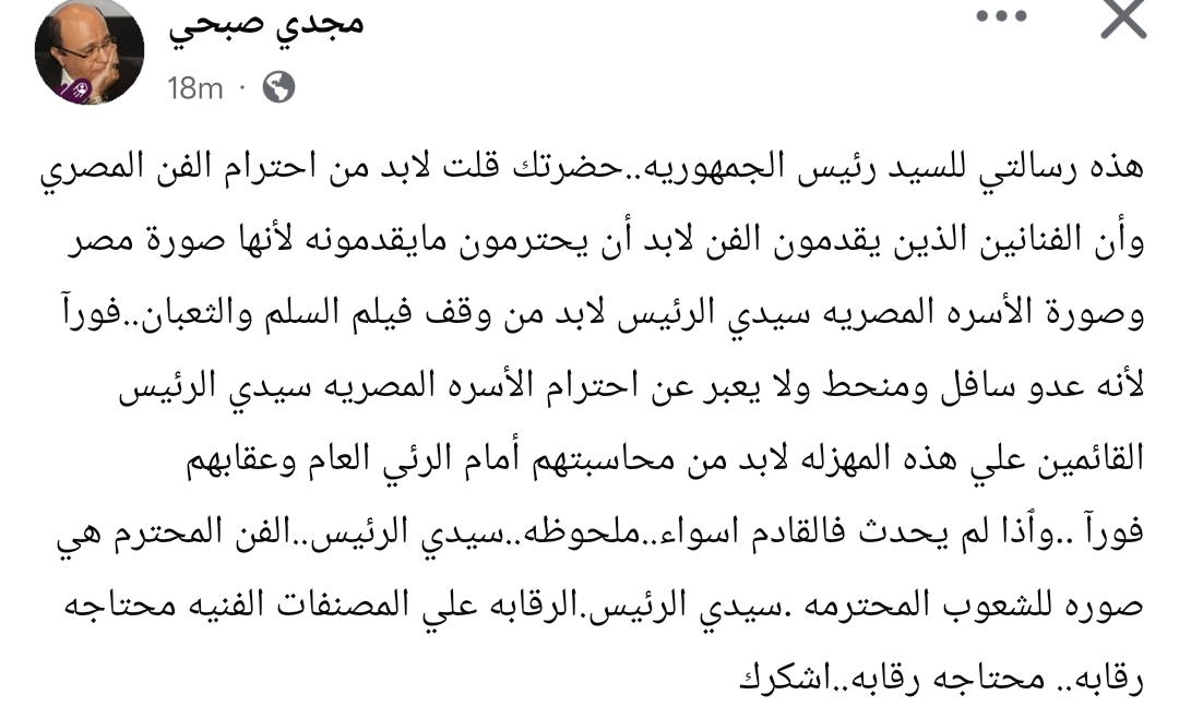 وكتب مجدي صبحي من خلال حسابه الرسمي عبر موقع التواصل الاجتماعي فيسبوك، قال: هذه رسالتي للسيد رئيس الجمهوريه .. حضرتك قلت لابد من احترام الفن المصري وأن الفنانين الذين يقدمون الفن لابد أن يحترمون ما يقدمونه لأنها صورة مصر وصورة الأسره المصريه.