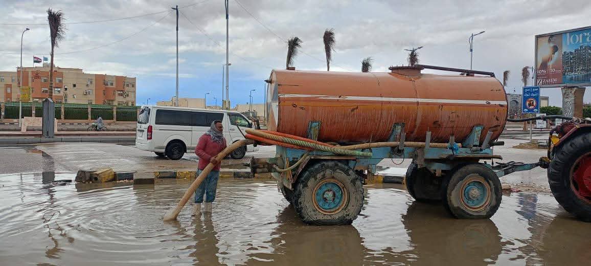 وفي مدينة السويس الجديدة، تمت متابعة أعمال سحب وشفط مياه الأمطار ميدانياً، والتأكد من كفاءة شبكات التصريف وانتظام عملها، مع الدفع بفرق العمل والمعدات إلى المناطق الحيوية، ومنها الطريق الساحلي والحي الصناعي والمنطقة الحرة، للتعامل الفوري مع تجمعات المياه.