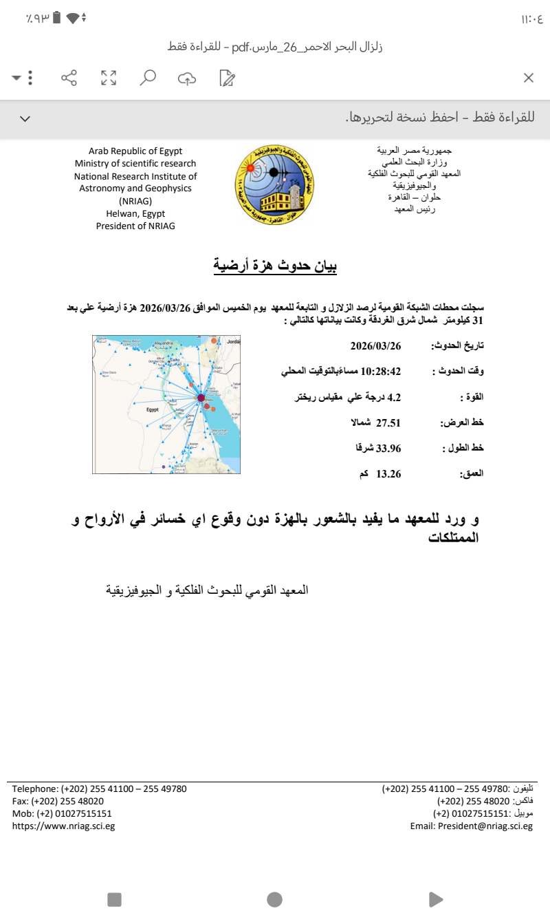 أعلن المعهد القومي للبحوث الفلكية والجيوفيزيقية عن تسجيل هزة أرضية بقوة 4.2 درجة على مقياس ريختر، مساء الخميس 26 مارس 2026 شمال شرق الغردقة.