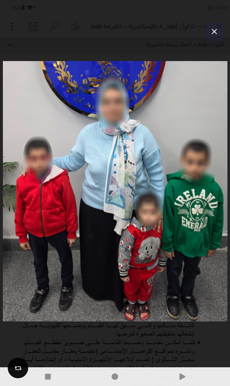 بالفحص أمكن تحديد و ضبط والدة الأطفال الثلاثة الظاهرين بمقطع الفيديو أعمارهم " 3- 6 - 8 " سنوات (مقيمة بدائرة قسم شرطة أول الرمل) وبسؤالها أقرت بقيام أنجالها المذكورين بمغافلتها والجلوس بالشباك أعلى أحد مفروشات الشقة سكنها والتى سبق لها القيام بوضعها للتهوية حال إنشغالها بشقيقتهم الصغيرة لمرضها.