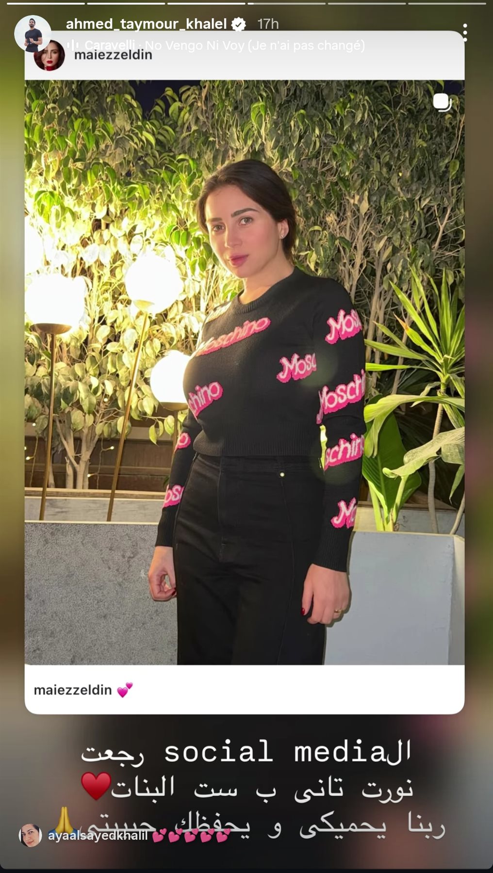 ونشر أحمد تيمور صورة لزوجته، من خلال حسابه الرسمي عبر موقع تبادل الصور والفيديوهات القصيرة إنستجرام، عبر خاصية ستوري، قال: السوشيال ميديا رجعت نورت تاني يا ست البنات، ربنا يحميكي ويحفظك حبيبتي.