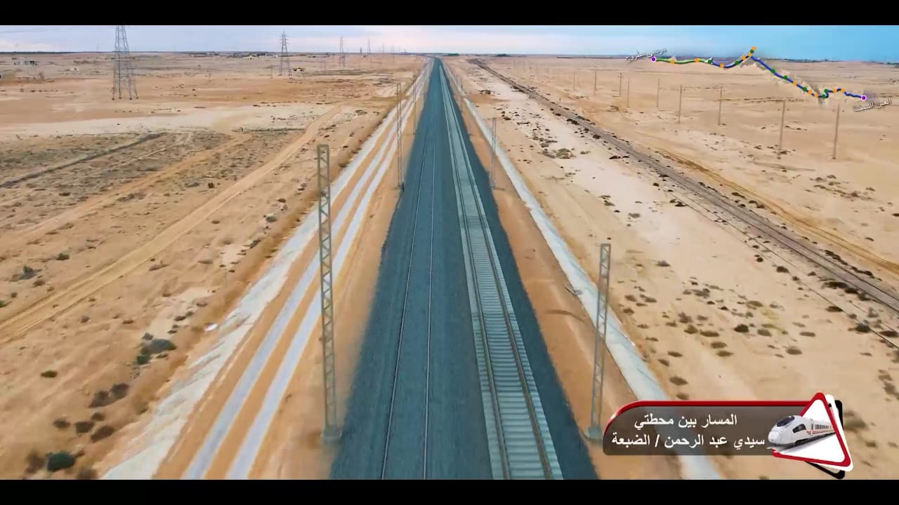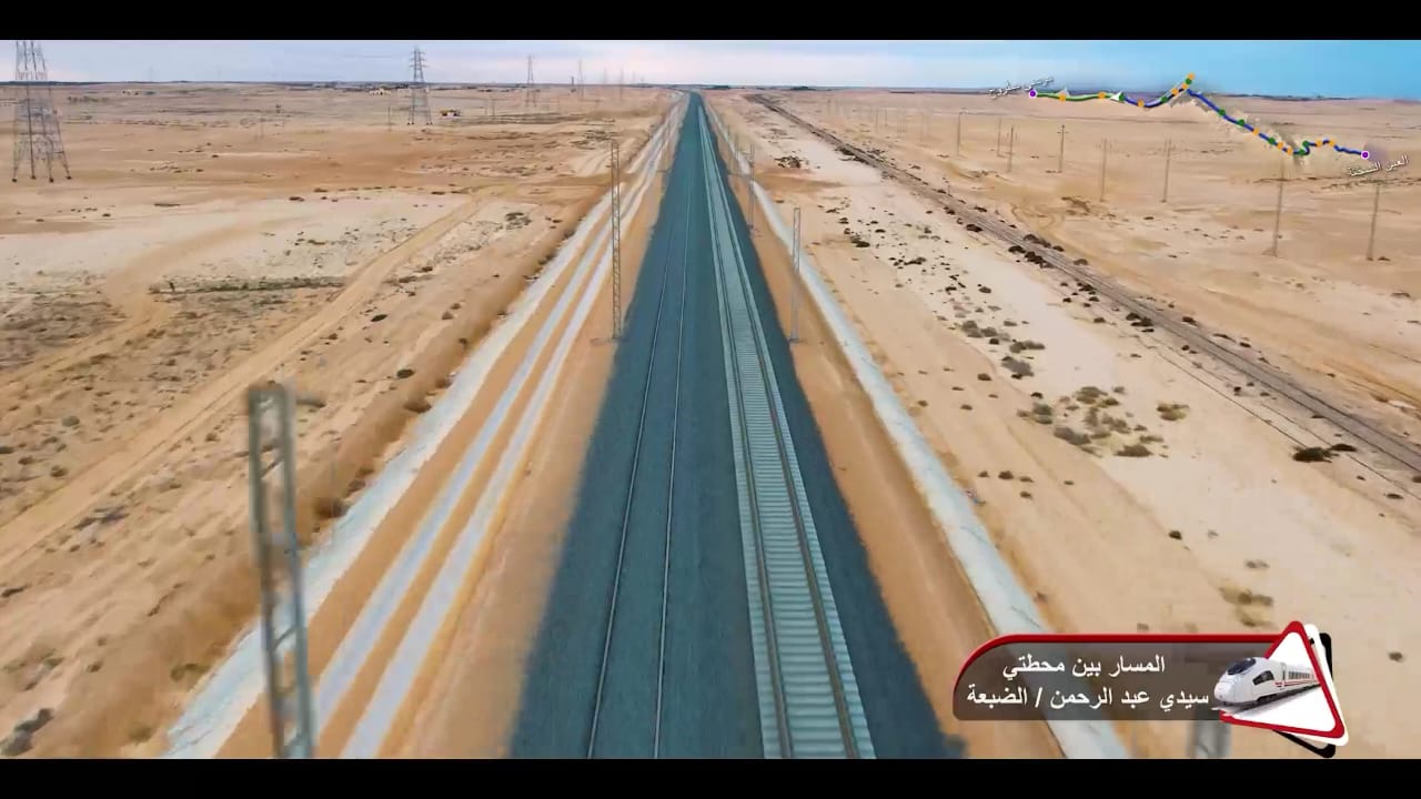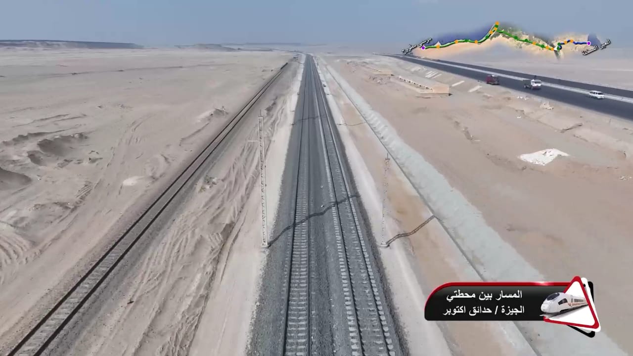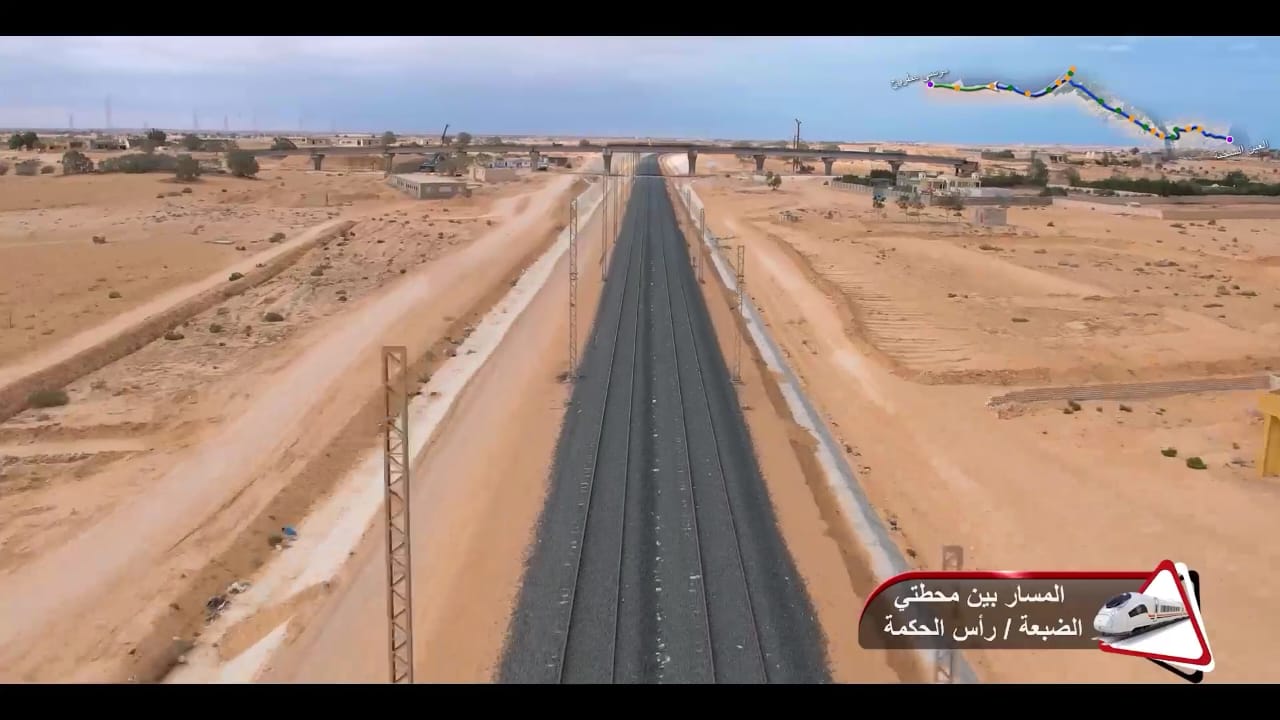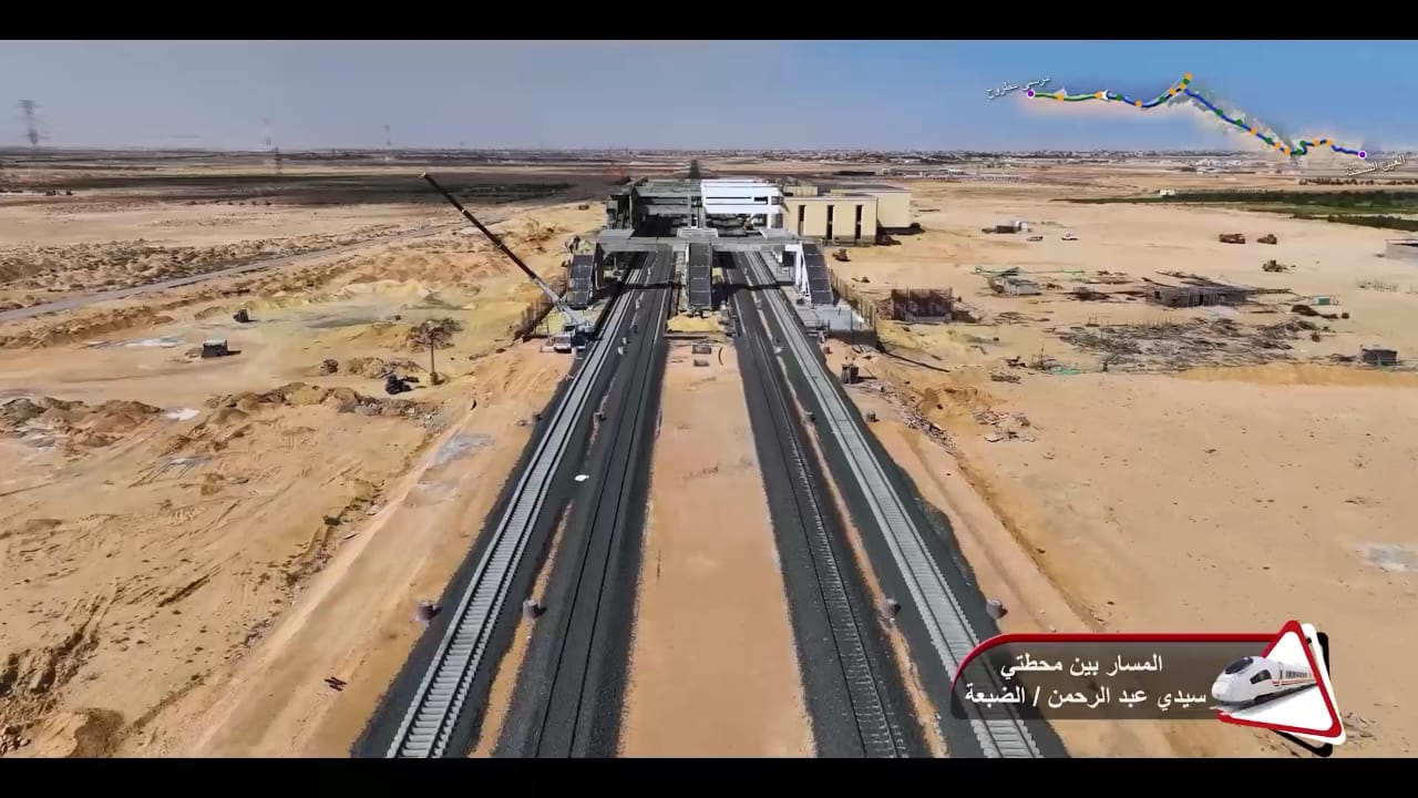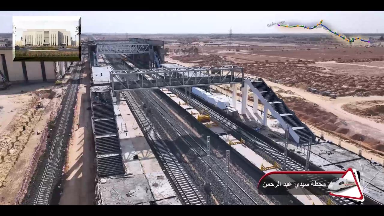 1. يتقدم العمل في أعمال تركيب القضبان وتشطيبات المحطات بمشروع الخط الأول من شبكة القطار الكهربائي السريع (السخنة/العلمين/مطروح)