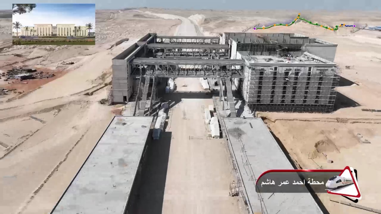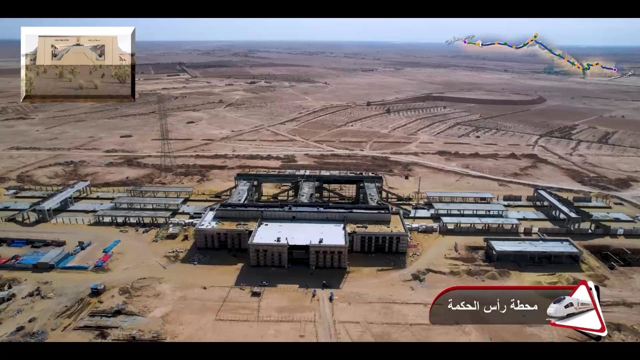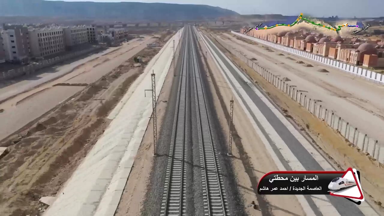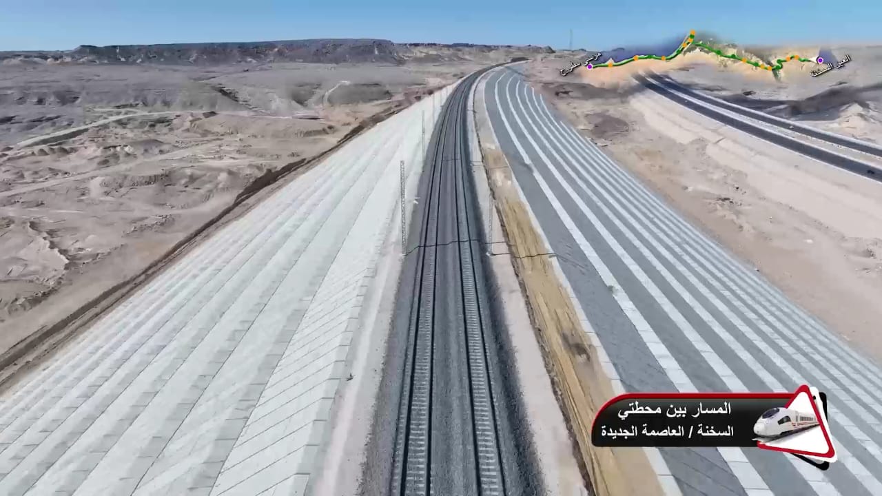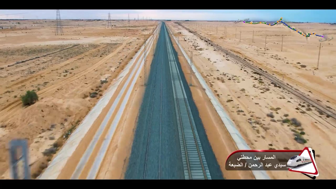 1. يتقدم العمل في أعمال تركيب القضبان وتشطيبات المحطات بمشروع الخط الأول من شبكة القطار الكهربائي السريع (السخنة/العلمين/مطروح)