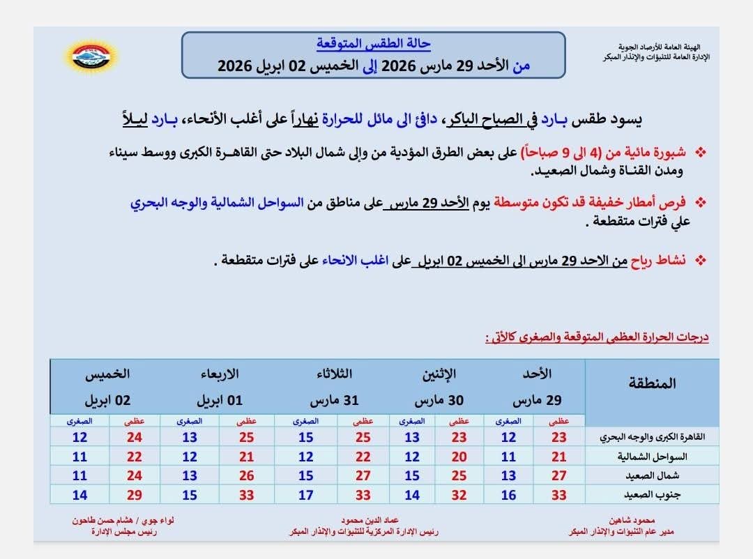 حالة الطقس في مصر خلال الأيام المقبلة..تشهد حالة الطقس في مصر خلال الأيام المقبلة تغيرات ملحوظة ما بين الأجواء الباردة صباحًا والطقس الدافئ نهارًا، بالتزامن مع نشاط للرياح وفرص لسقوط أمطار خفيفة على بعض المناطق، وفق التوقعات الجوية للفترة من الأحد 29 مارس 2026 وحتى الخميس 2 أبريل 2026، وسط تحذيرات من الشبورة المائية خلال ساعات الصباح الأولى على عدد من الطرق الرئيسية.