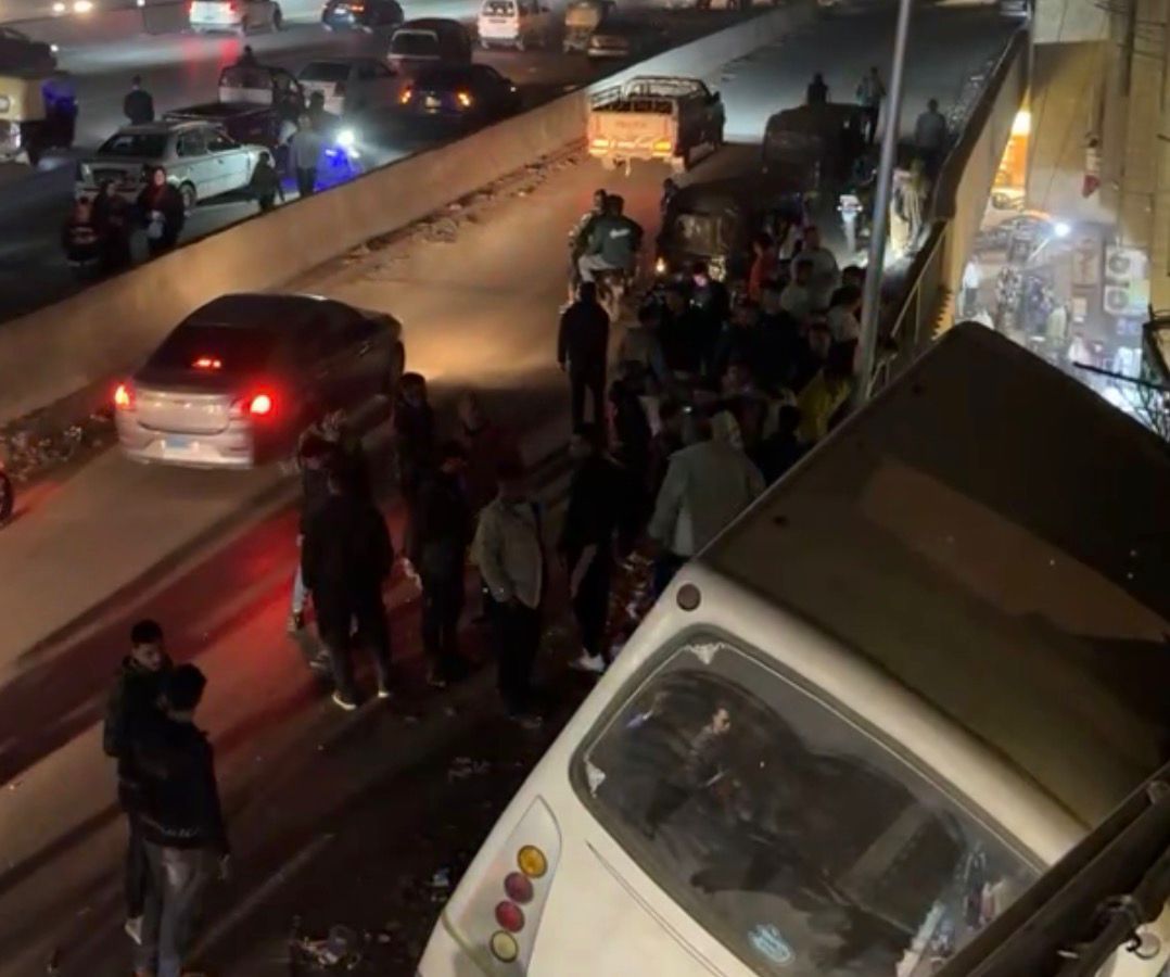 بين السما والأرض.. انحراف أتوبيس عند نزلة كوبري عرابي أعلى الطريق الدائري بالجيزة