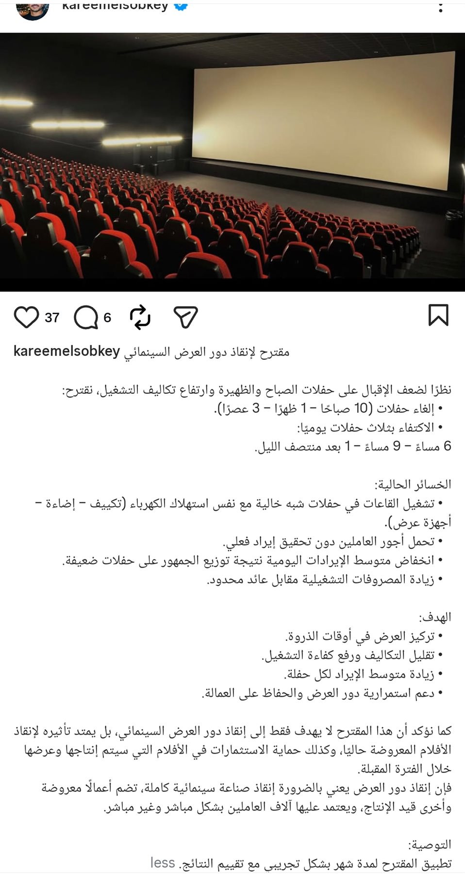 أختتم: فإن إنقاذ دور العرض يعني بالضرورة إنقاذ صناعة سينمائية كاملة، تضم أعمالاً معروضة وأخرى قيد الإنتاج، ويعتمد عليها آلاف العاملين بشكل مباشر وغير مباشر.. التوصية: تطبيق المقترح لمدة شهر بشكل تجريبي مع تقييم النتائج.
