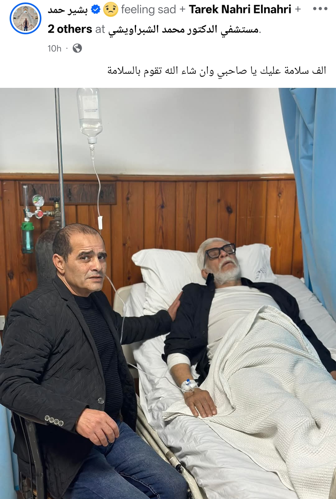 كما حرص على دعمه، ونشر صورة من داخل المستشفى، من خلال حسابه الرسمي عبر موقع التواصل الاجتماعي فيسبوك، وكتب: ألف سلامة عليك يا صاحبي وإن شاء الله تقوم بالسلامة.