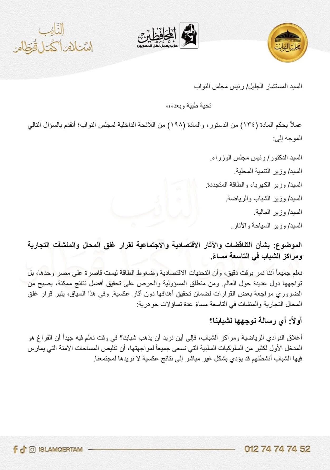 تقدم النائب إسلام قرطام، عضو مجلس النواب عن حزب المحافظين، بأسئلة برلمانية رسمية إلى الوزراء المعنيين، بشأن قرار غلق المحال والمنشآت في تمام الساعة التاسعة مساءً، وذلك في إطار استخدام الأدوات الرقابية المتاحة للوقوف على أبعاد القرار وتداعياته.