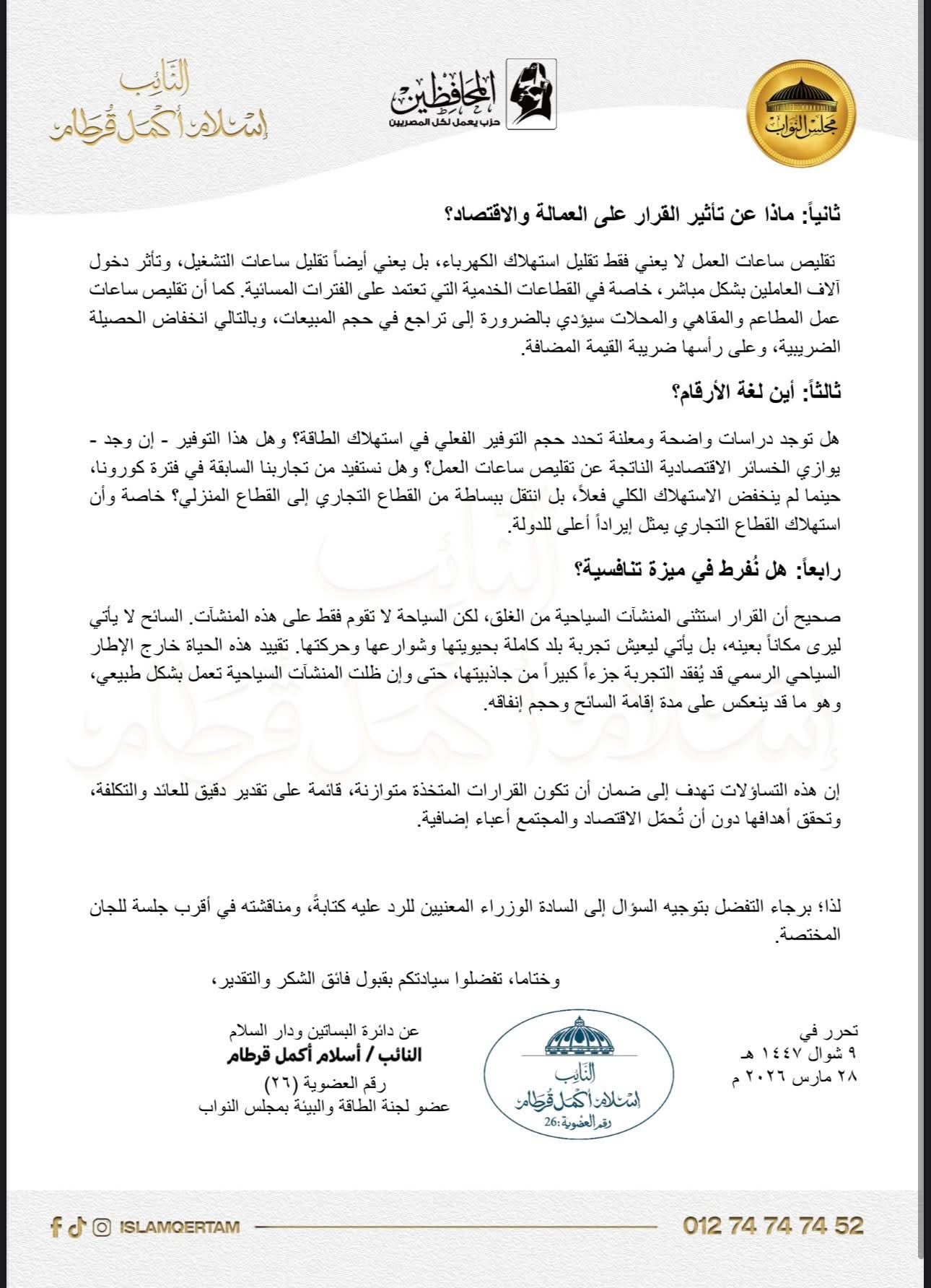 وطالب قرطام، في أسئلته، بتقديم ردود واضحة ومدعومة بالأرقام حول عدد من التساؤلات الجوهرية، في مقدمتها حجم التوفير الفعلي في استهلاك الطاقة الناتج عن تطبيق القرار، وما إذا كانت هناك دراسات معلنة تستند إليها الحكومة في هذا التقدير.