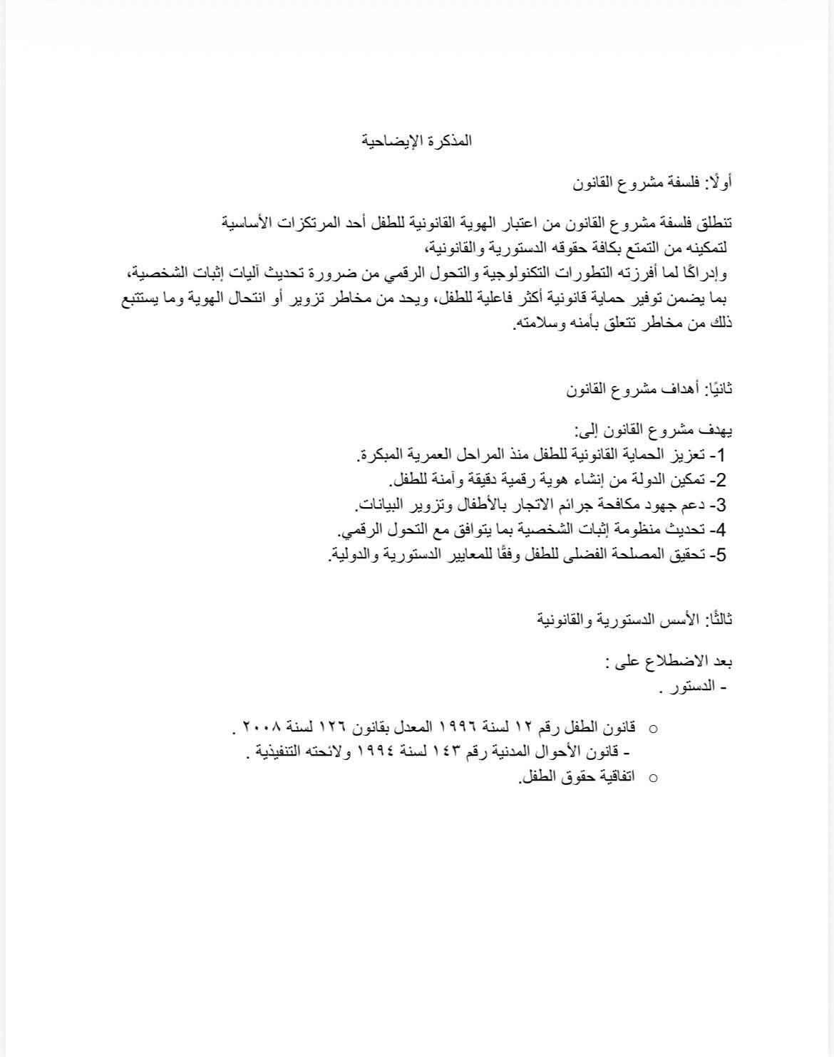 وفي إطار هذا الالتزام، أودعت النائبة اليوم بالأمانة العامة لمجلس النواب مشروع قانون لتعديل المادة 2 من قانون الطفل، يقضي بمنح بطاقة الرقم القومي للطفل اعتبارًا من عامه الخامس، متضمنة البيانات المحدثة والصورة الشخصية.