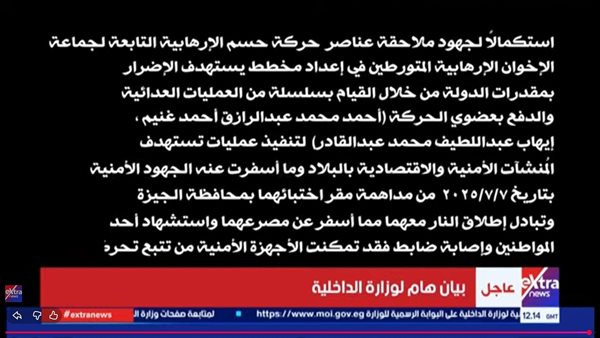 أصدرت وزارة الداخلية بياناً عاجلاً كشفت فيه عن نجاح الأجهزة الأمنية في توجيه ضربة استباقية جديدة لعناصر حركة "حسم" الإرهابية، التابعة لجماعة الإخوان، وذلك في إطار جهود الدولة المستمرة لملاحقة الكيانات المتورطة في زعزعة الاستقرار الوطني.