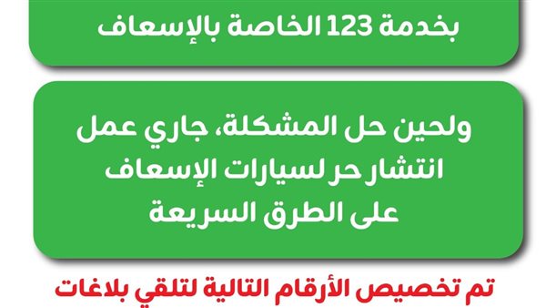 ومع عودة تشغيل الخط الساخن بشكل كامل أكدت هيئة الإسعاف أنه لم يعد هناك حاجة لاستخدام الأرقام البديلة التي تم الإعلان عنها مسبقا حيث يمكن للمواطنين الاعتماد مرة أخرى على الرقم 123 في طلب سيارات الإسعاف في أي وقت