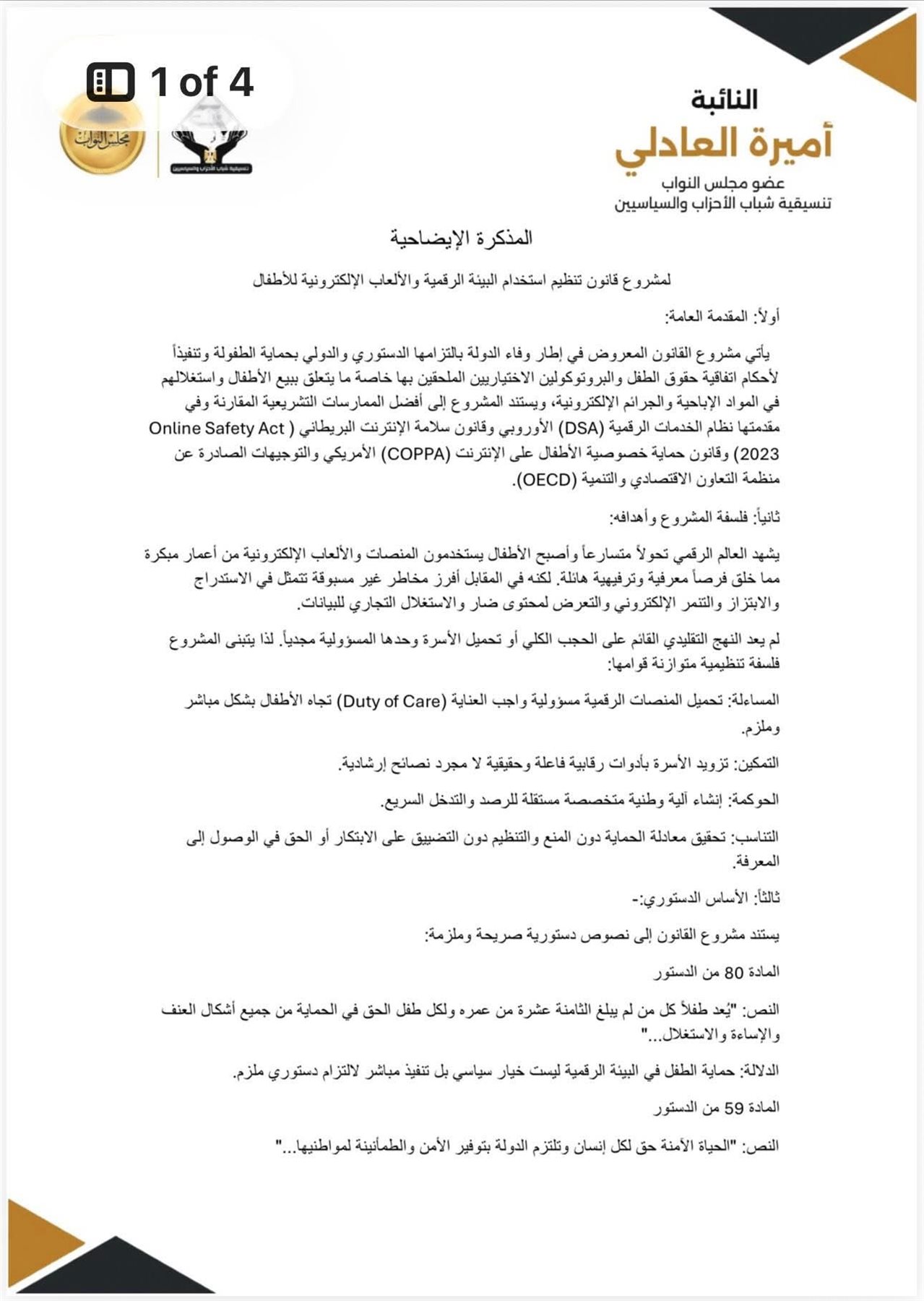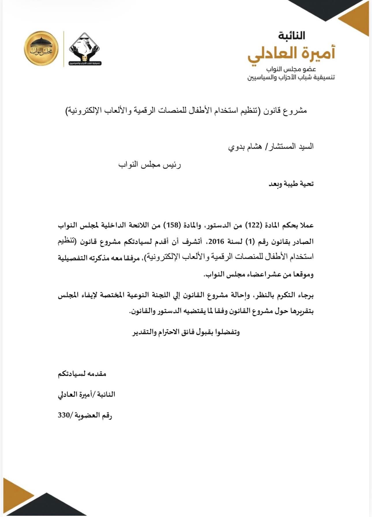 تقدمت النائية أميرة العادلى عضو مجلس النواب عن تنسيقية شباب الأحزاب والسياسيين بمشروع قانون تنظيم استخدام البيئة الرقمية والألعاب الإلكترونية للأطفال، هذا في إطار التزام الدولة بحماية حقوق الطفل ومواكبة التحولات الرقمية المتسارعة، طُرح مشروع القانون الجديد مستندًا إلى الدستور المصري والاتفاقيات الدولية، وفي مقدمتها اتفاقية حقوق الطفل، إلى جانب أفضل الممارسات التشريعية العالمية.