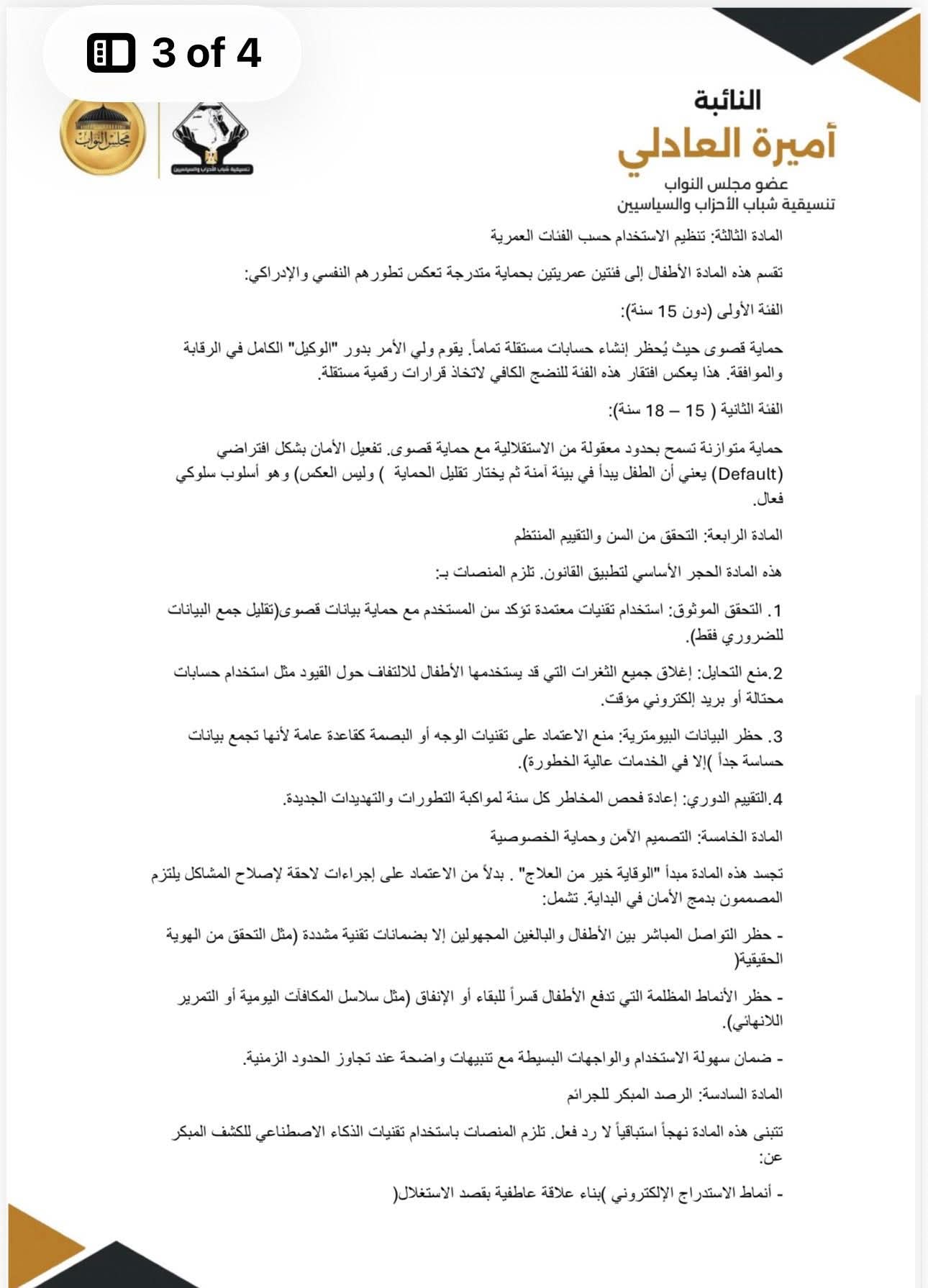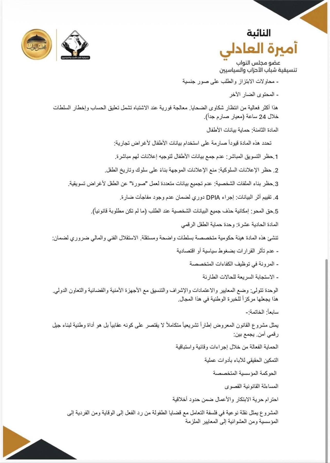 وارتكز المشروع على نصوص دستورية ملزمة، أبرزها المادة (80) التي تكفل حماية الطفل من كل أشكال العنف والاستغلال، والمادة (59) التي تؤكد حق المواطن في حياة آمنة، بما يشمل الأمن الرقمي كجزء أساسي من هذا الحق.