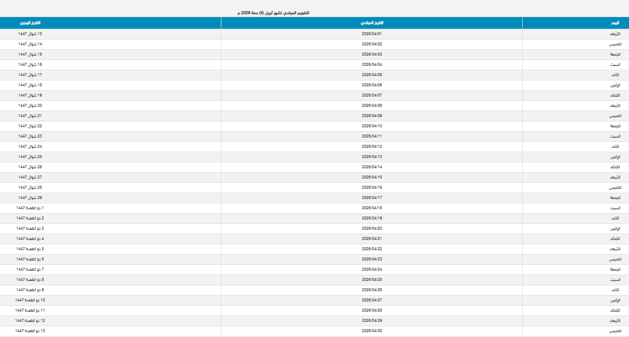 إليك تقويم شهر أبريل 2026، موضحاً فيه أيام الأسبوع وتواريخ الإجازات الرسمية المرتقبة: