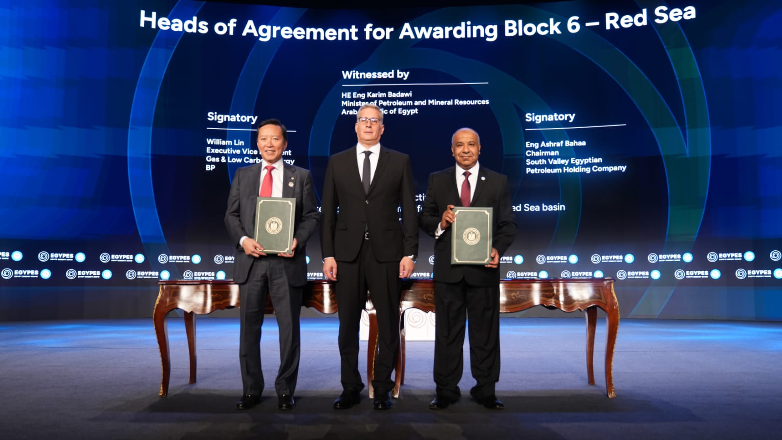 وقع الاتفاقية المهندس أشرف بهاء، رئيس شركة جنوب الوادي المصرية القابضة للبترول، والسيد ويليام لين، نائب الرئيس التنفيذي لقطاع الغاز والطاقة منخفضة الكربون بشركة بي بي.