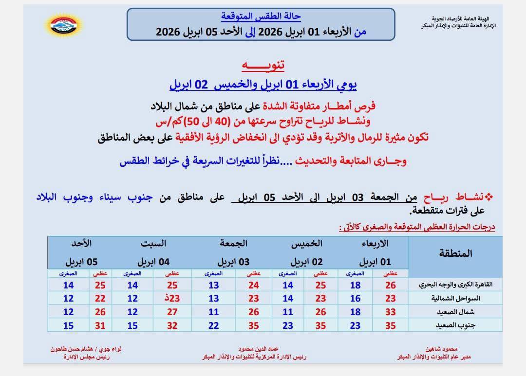 ومن الجمعة 3 أبريل إلى الأحد 5 أبريل، تتوقع الأرصاد أمطاراً على فترات متقطعة على مناطق من جنوب سيناء وجنوب البلاد، مع استمرار نشاط الرياح المثيرة للرمال والأتربة.